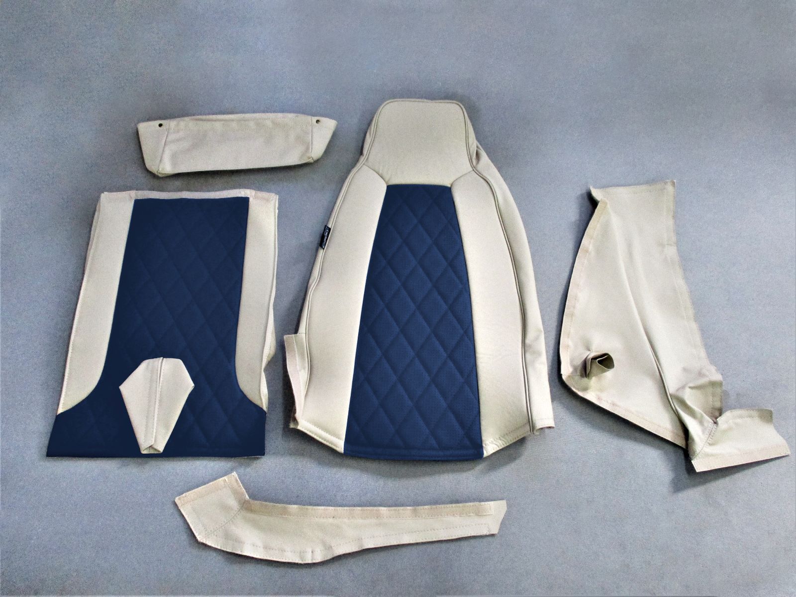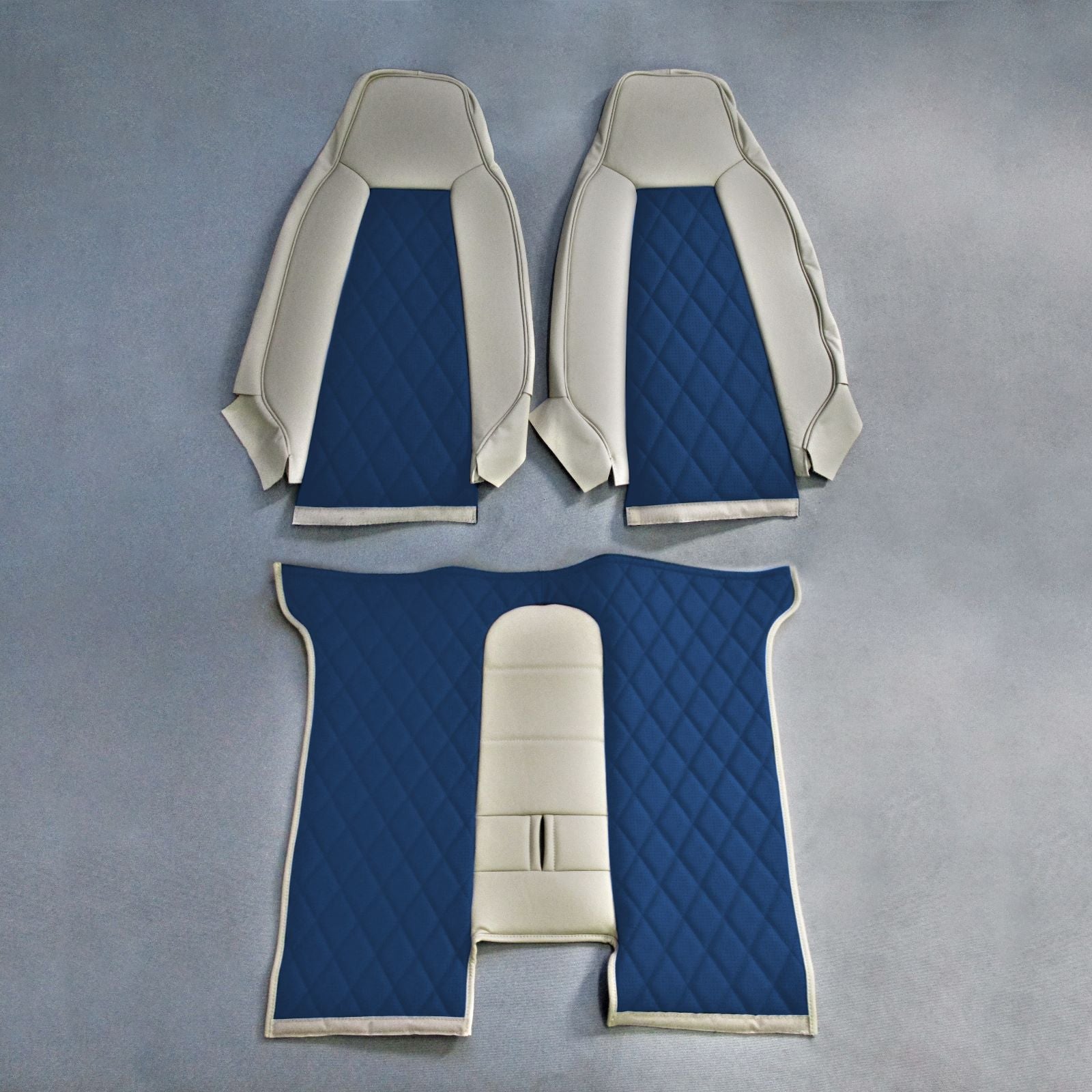 The seat covers provided feature a dark-on-light, two-tone design, combining sand leather (ADI-4041) for the main areas and navy blue leather (ADI-2021) for the inserts. The navy blue inserts are perforated with SP-05 perforation, ensuring both breathability and a premium look. These inserts are stitched with SA001 Diamond stitching in matching navy blue thread, adding a subtle decorative touch. The outer seams are framed with a line of sand leather piping, offering a sleek, finished look.