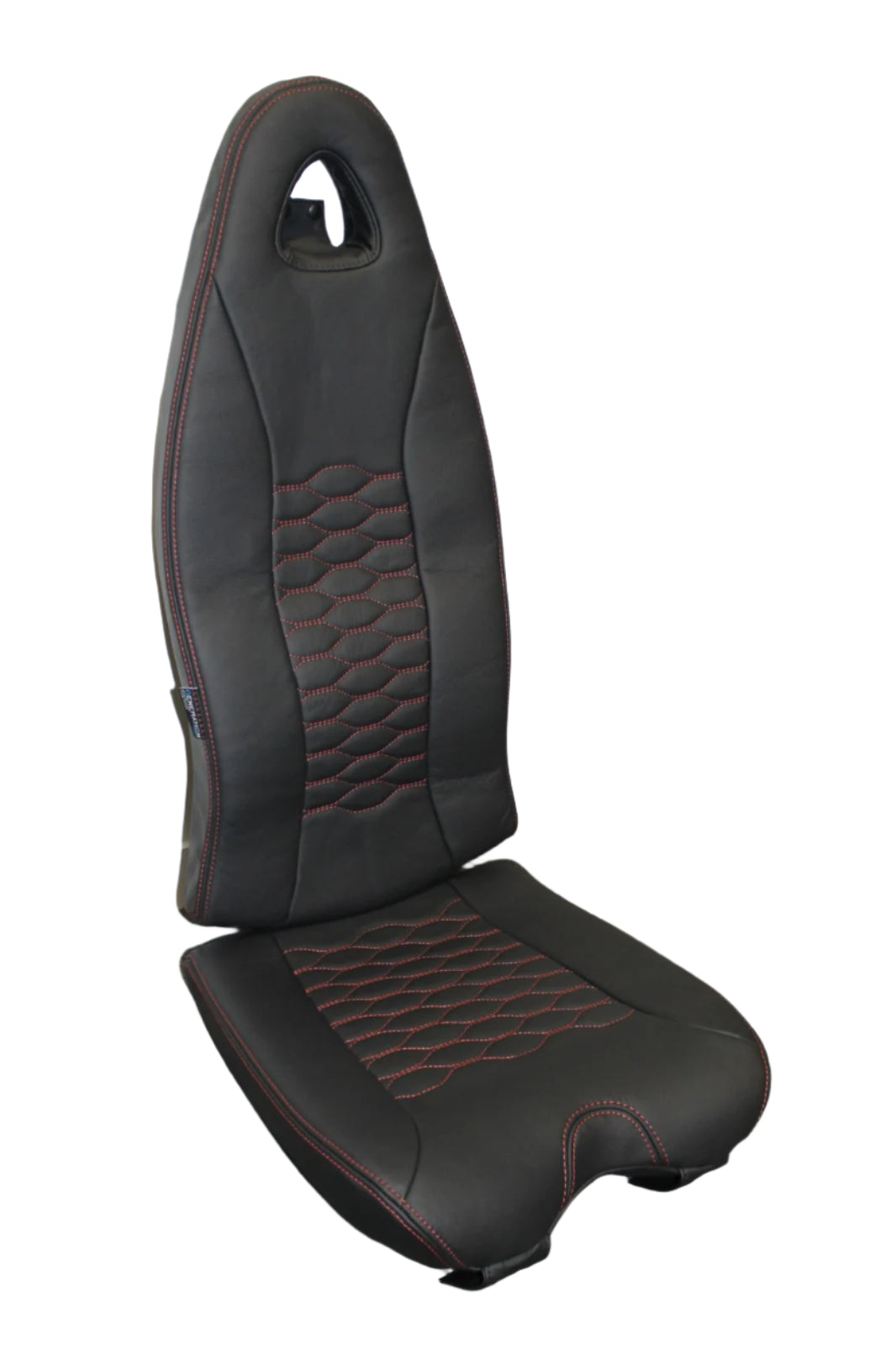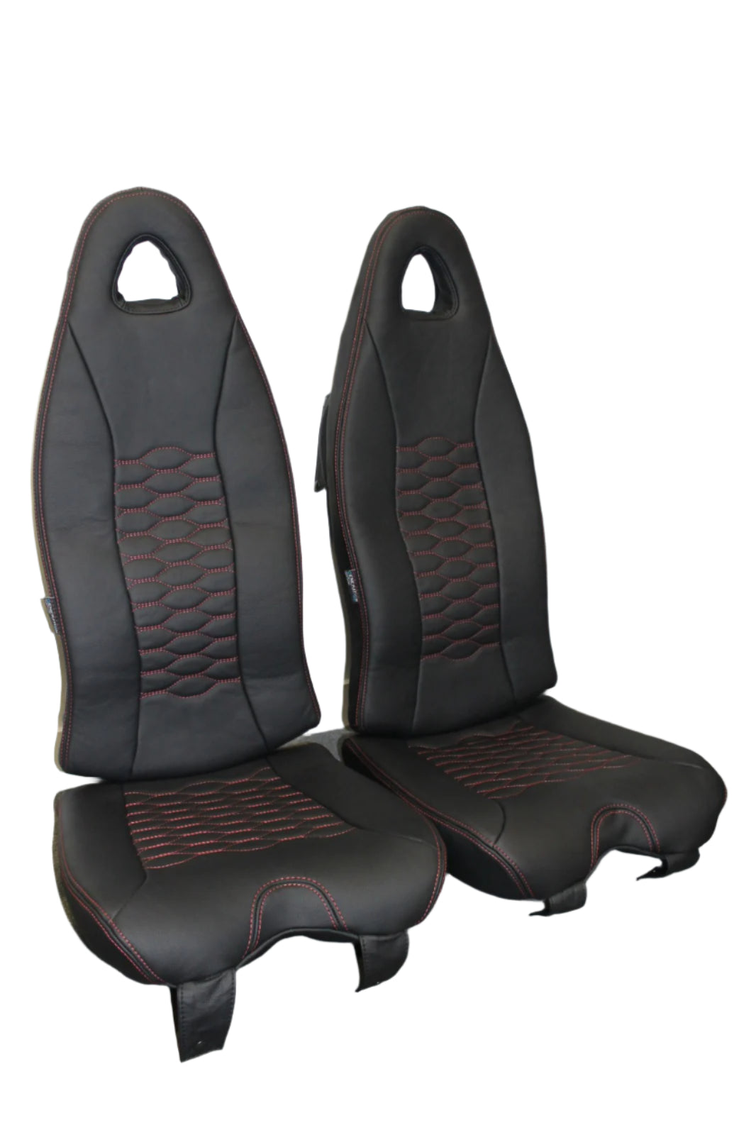 The seat dress covers were crafted from high-quality black aviation leather (ADI-1091), with bold red double stitching featured prominently on the outer seams and the quilted center inserts. The inserts were designed with the Curve Honeygrid (SA010) pattern for a modern and stylish look that enhances both comfort and aesthetic appeal.