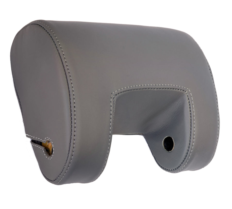For the headrests, Charcoal Grey (ADI-1121FR) aviation leather is used, featuring a placard embroidered into the rear face. The headrest is designed to fit onto an adjustable frame, offering both comfort and flexibility.