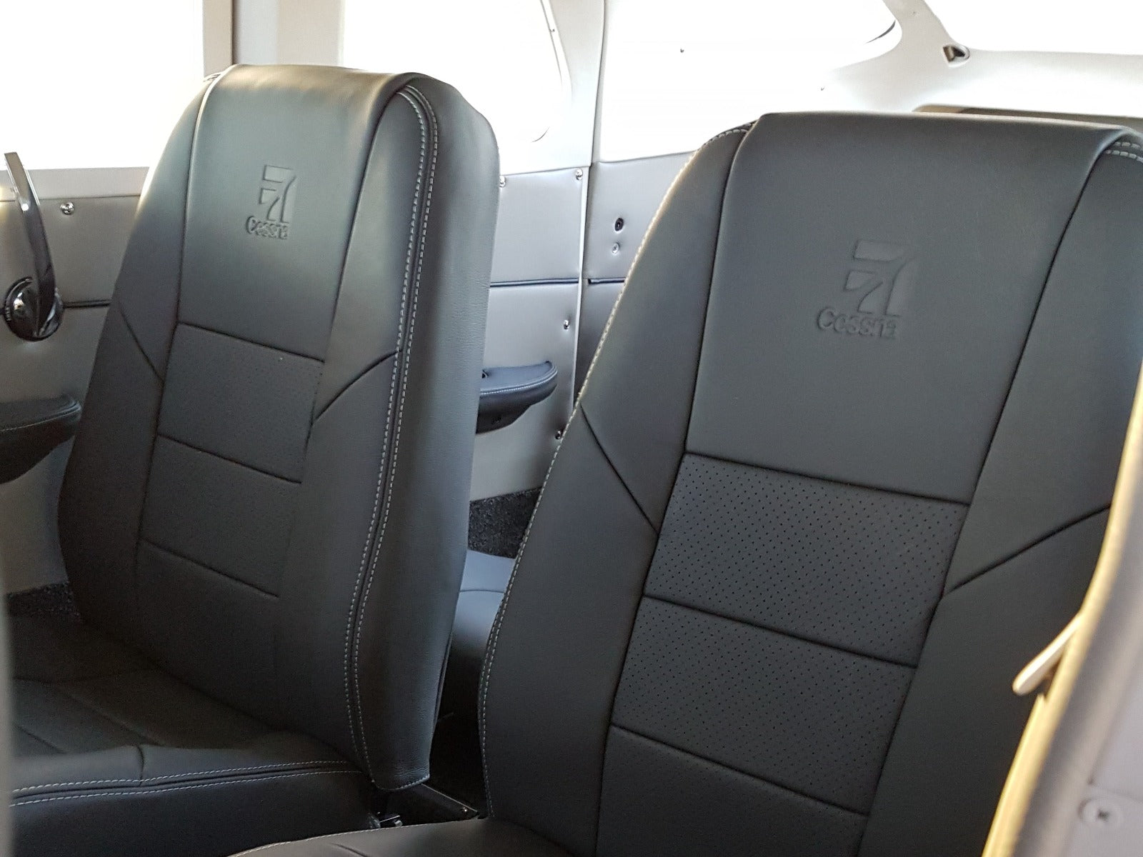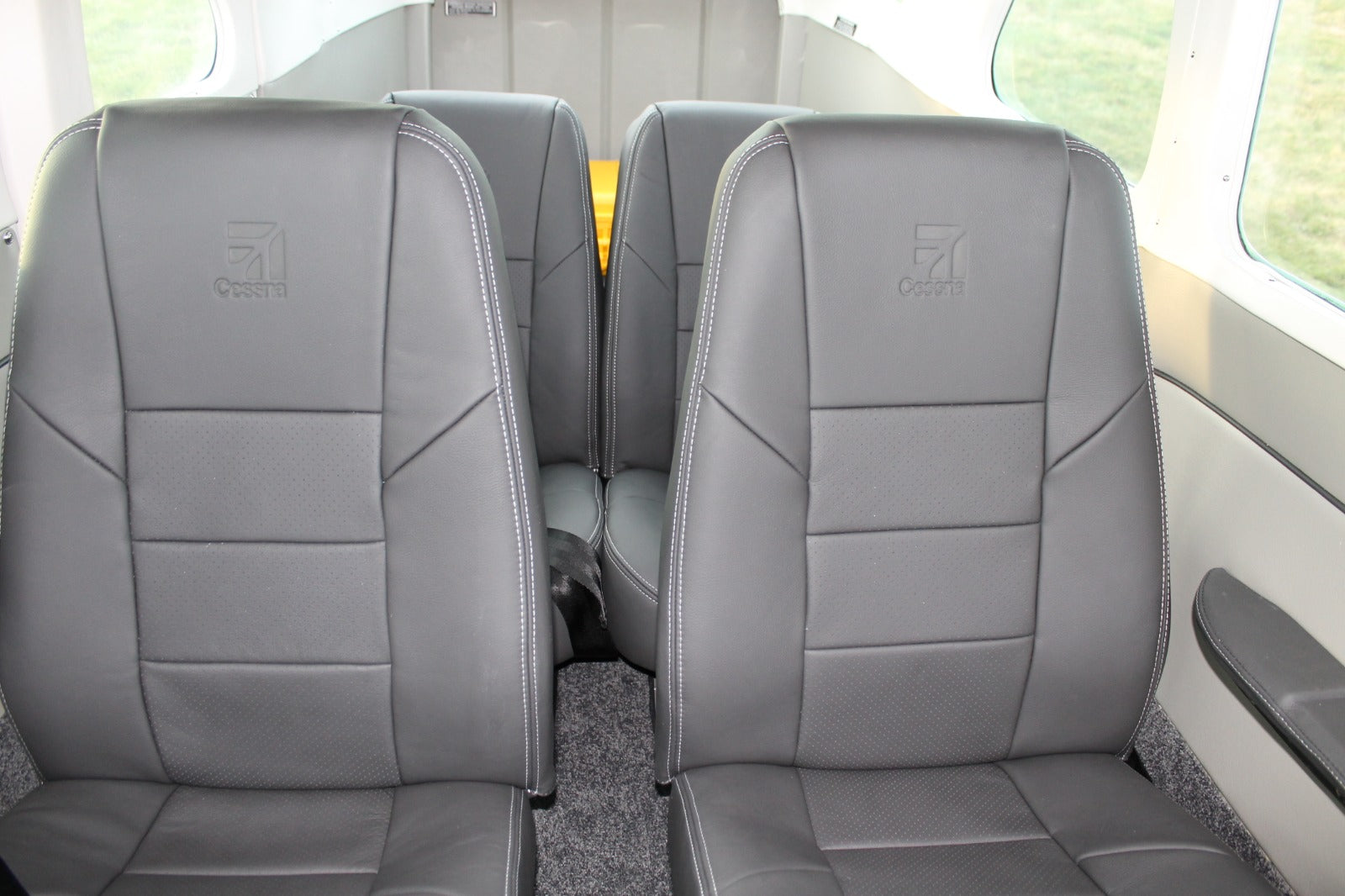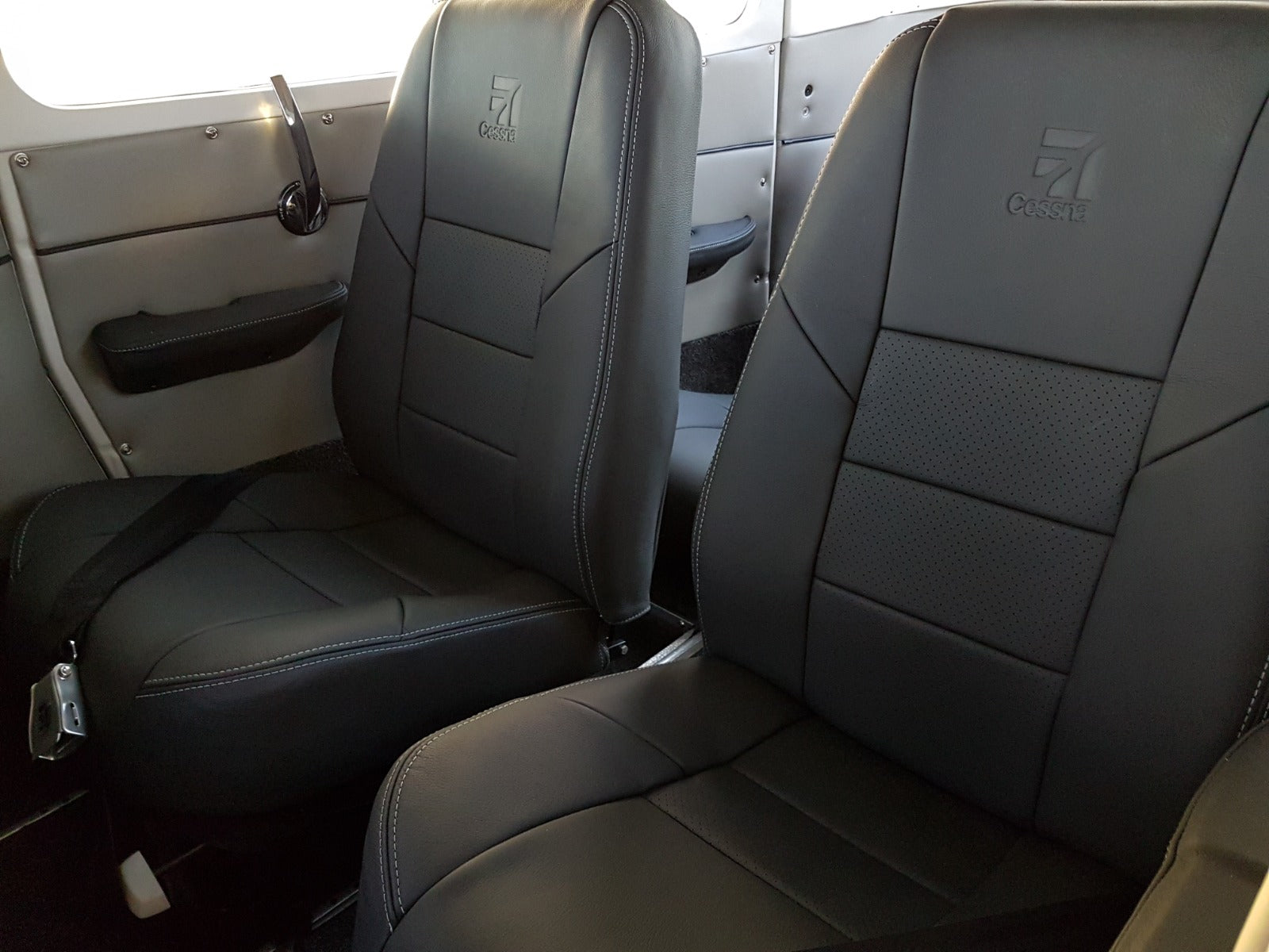This Cessna 206 is a six-seater aircraft, comprising two crew seats, two middle-row seats, and two aft seats. The seat covers and cushions were all refurbished with the same styling, featuring lead grey leather with perforated inserts for added texture. The seats were finished with titanium grey stitching, providing a noticeable contrast against the darker leather, and each backrest was debossed with the Cessna logo for an added touch of brand elegance.