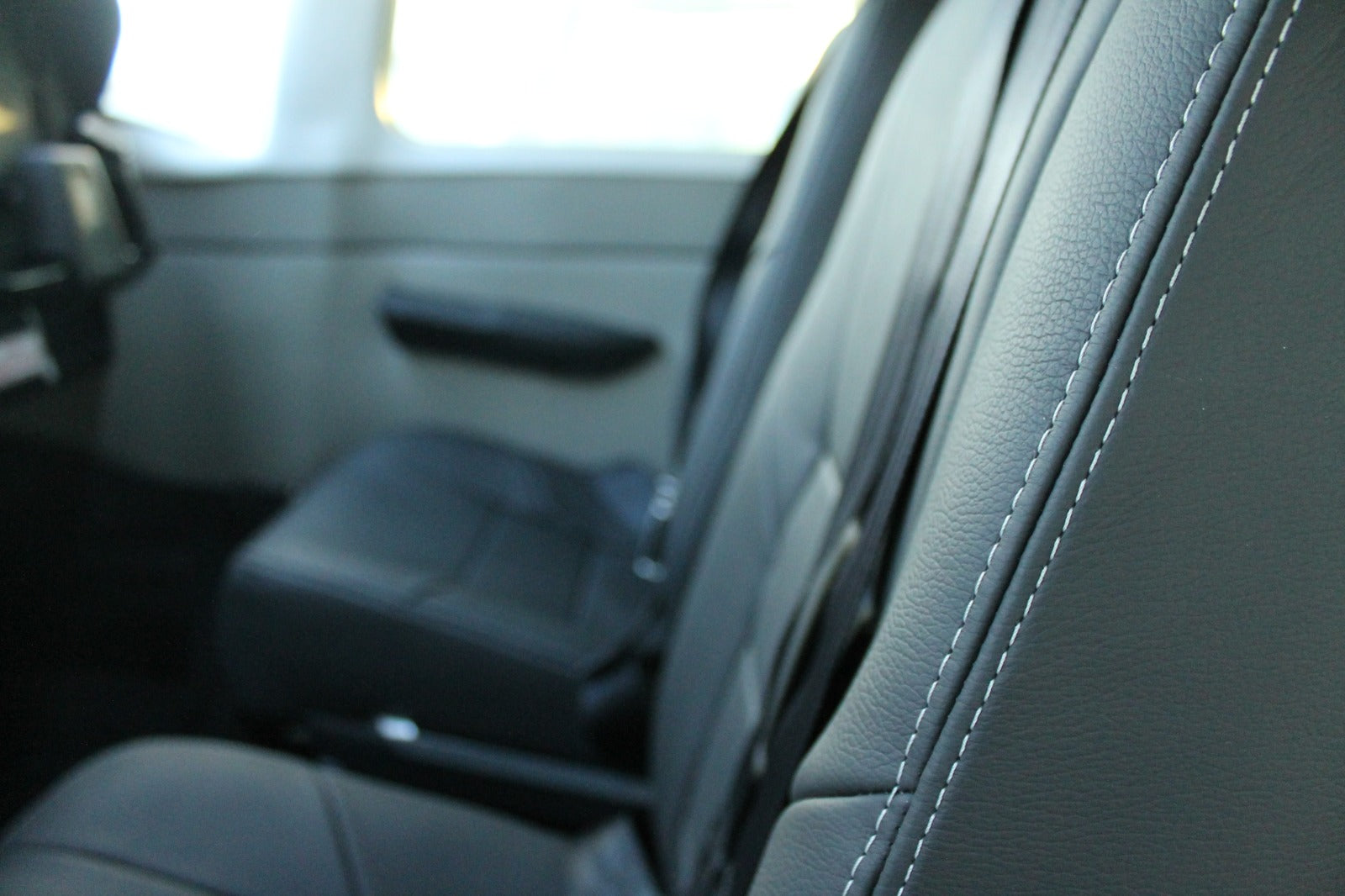 The interior sidewalls featured a unique horizontal detailing line that runs the length of the cabin, crafted from the same leather used for the seats. The armrests were mounted along the walls and wrapped in dark lead grey leather, offering a seamless transition between the sidewalls and seating areas.
