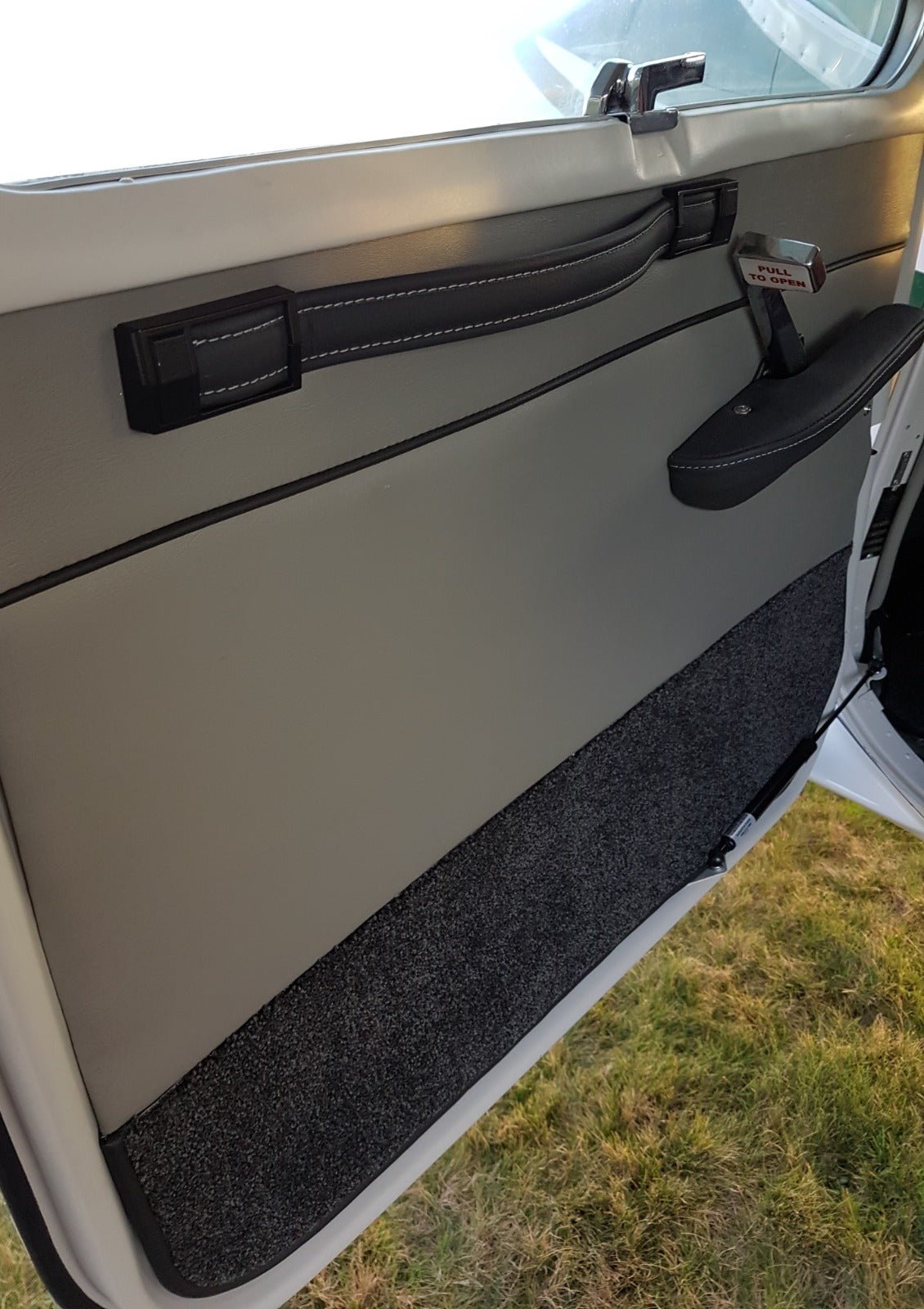 In the cockpit, we refurbished both control yokes, wrapping them in black leather and adding new badges and decals. The glare shield cover was rewrapped in black UV-resistant vinyl, ensuring protection against wear and tear. We also installed new draught excluders and seals around the doors to enhance the overall comfort of the cabin.