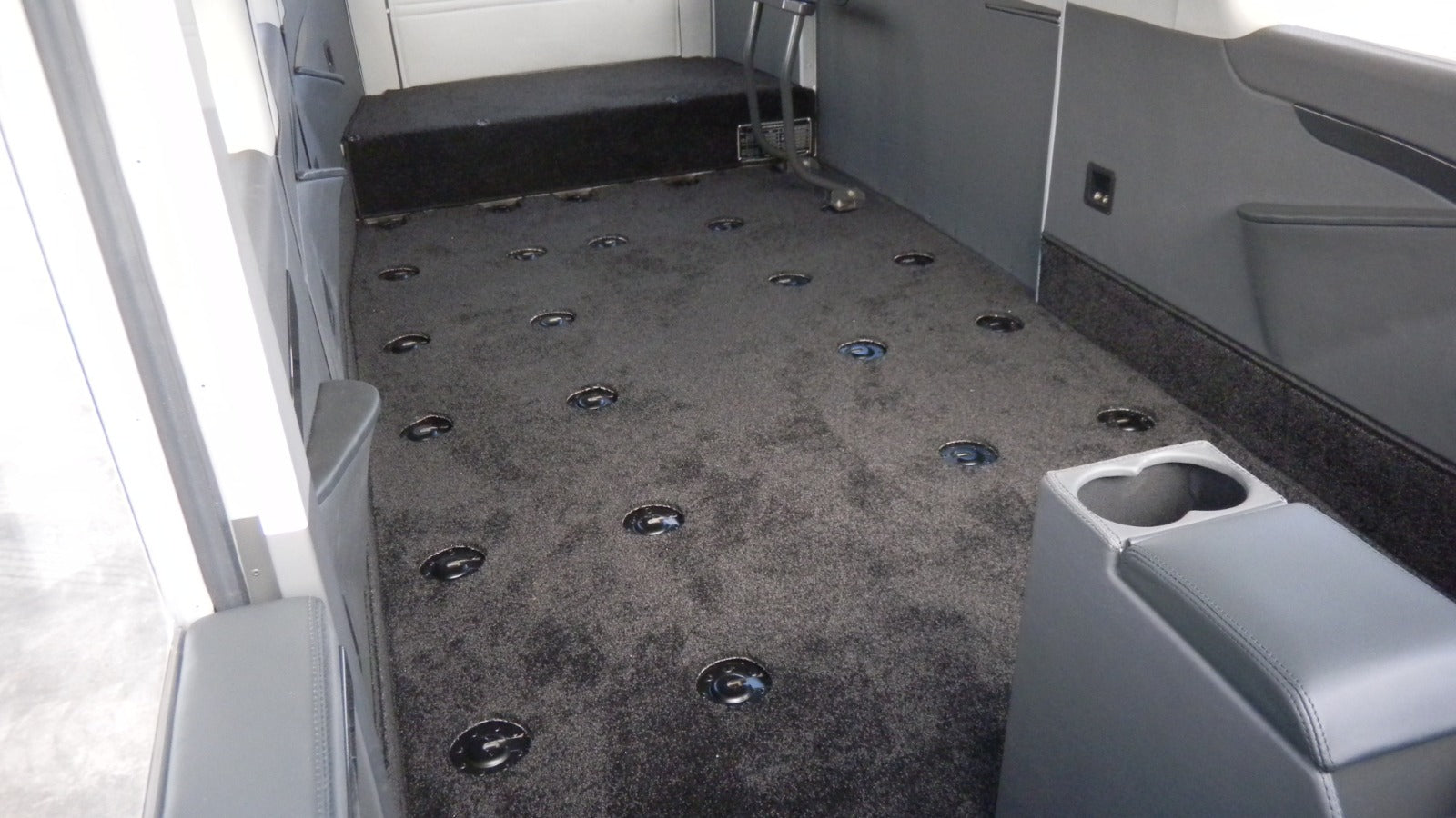 Seat Covers: The crew and passenger seats were reupholstered with charcoal grey leather (ADI-1121), which was perforated with our SP1 perforation for added style and comfort.