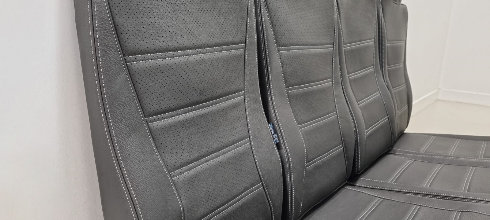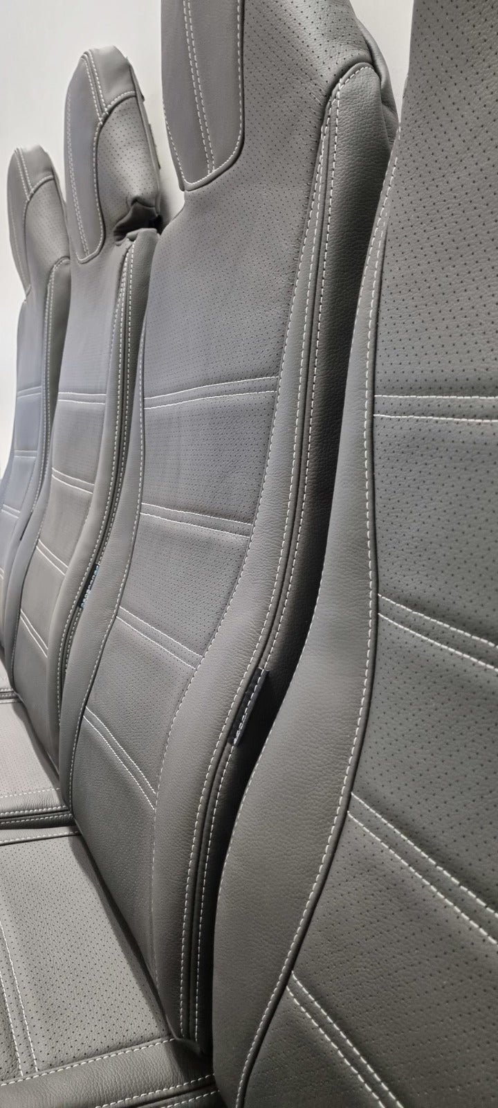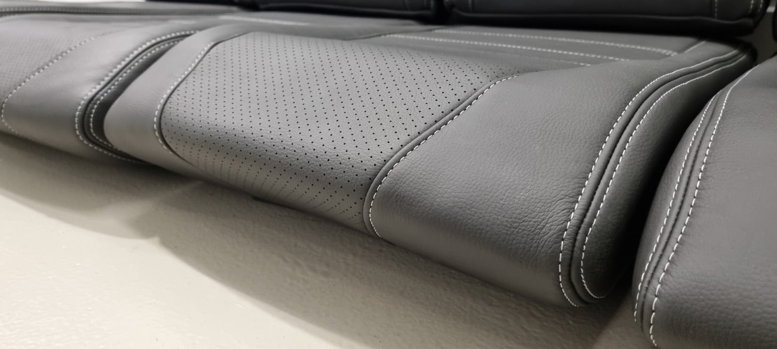 The seat dress covers were crafted from lead grey leather (ADI-1111), with silver stitching for a refined look. The center inserts are perforated (SP-1) to improve breathability, creating a subtle texture difference. The horizontal stitch lines further enhance the design and visually break up the panels. The design also includes a built-in headrest with a cut-out to allow the seatbelts to feed through from behind, providing added functionality.