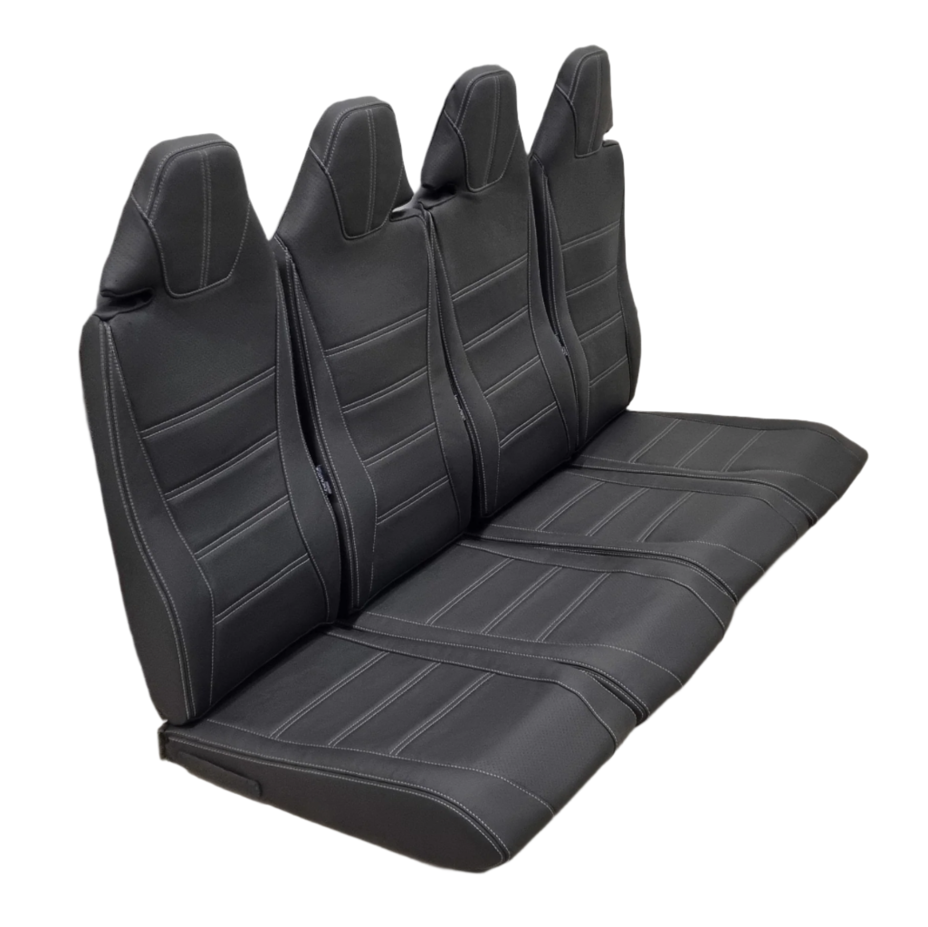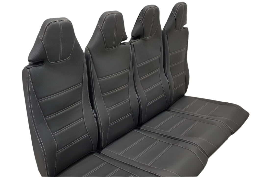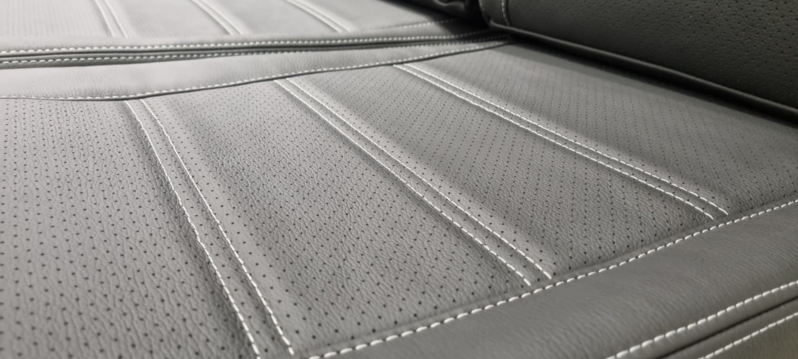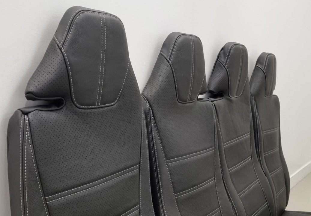 The seat dress covers were crafted from lead grey leather (ADI-1111), with silver stitching for a refined look. The center inserts are perforated (SP-1) to improve breathability, creating a subtle texture difference. The horizontal stitch lines further enhance the design and visually break up the panels. The design also includes a built-in headrest with a cut-out to allow the seatbelts to feed through from behind, providing added functionality.