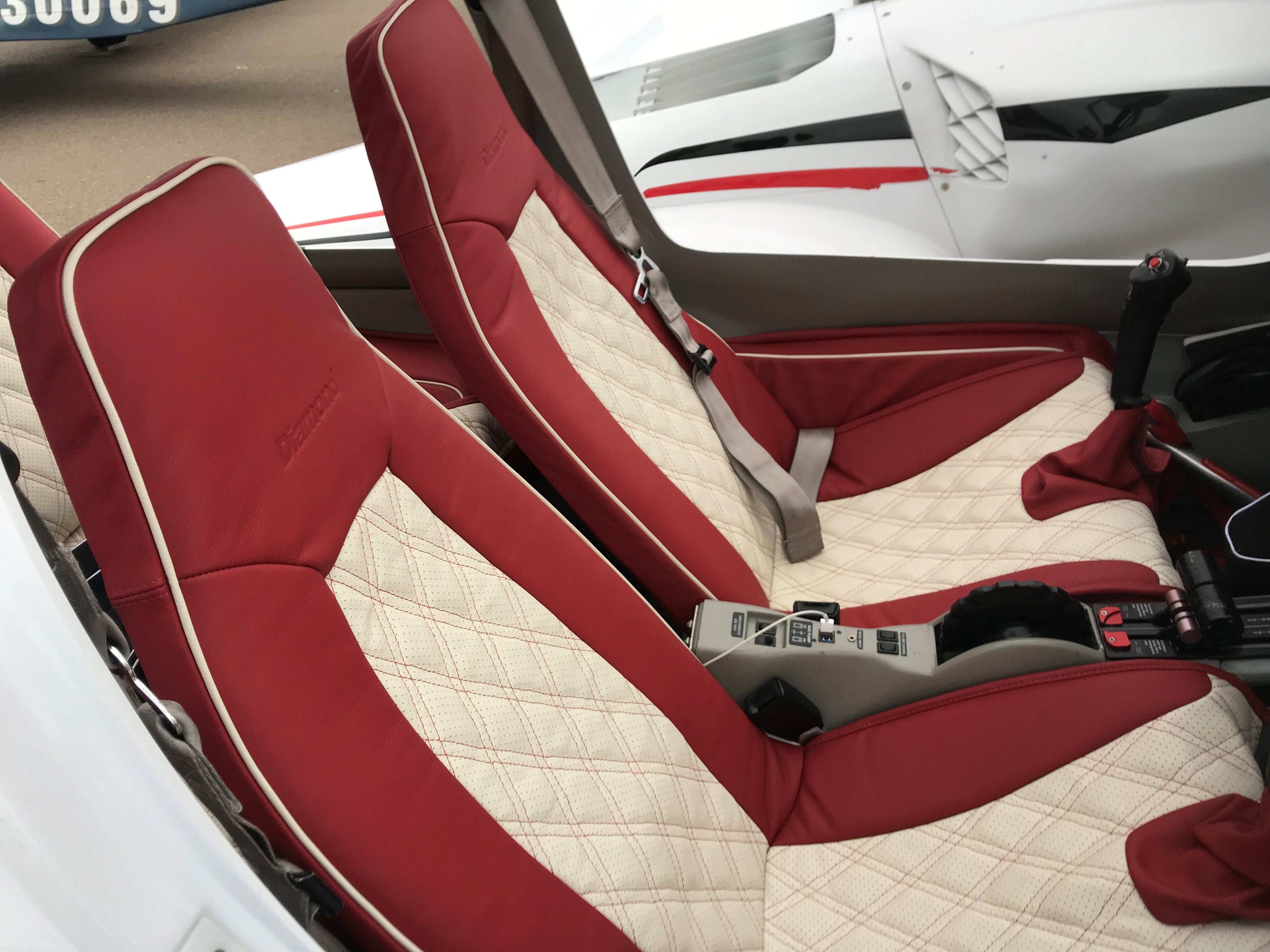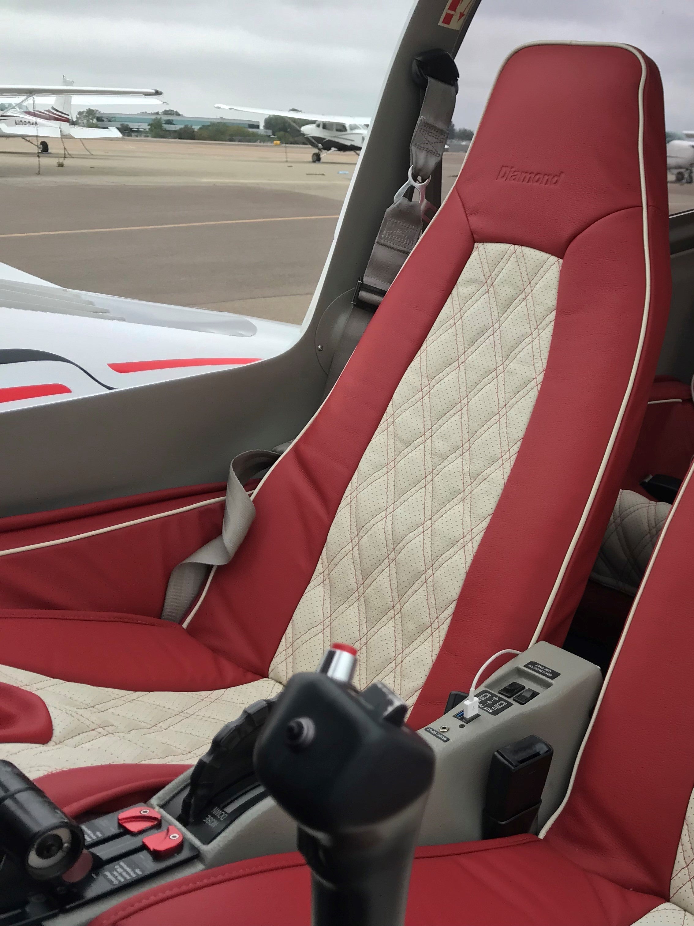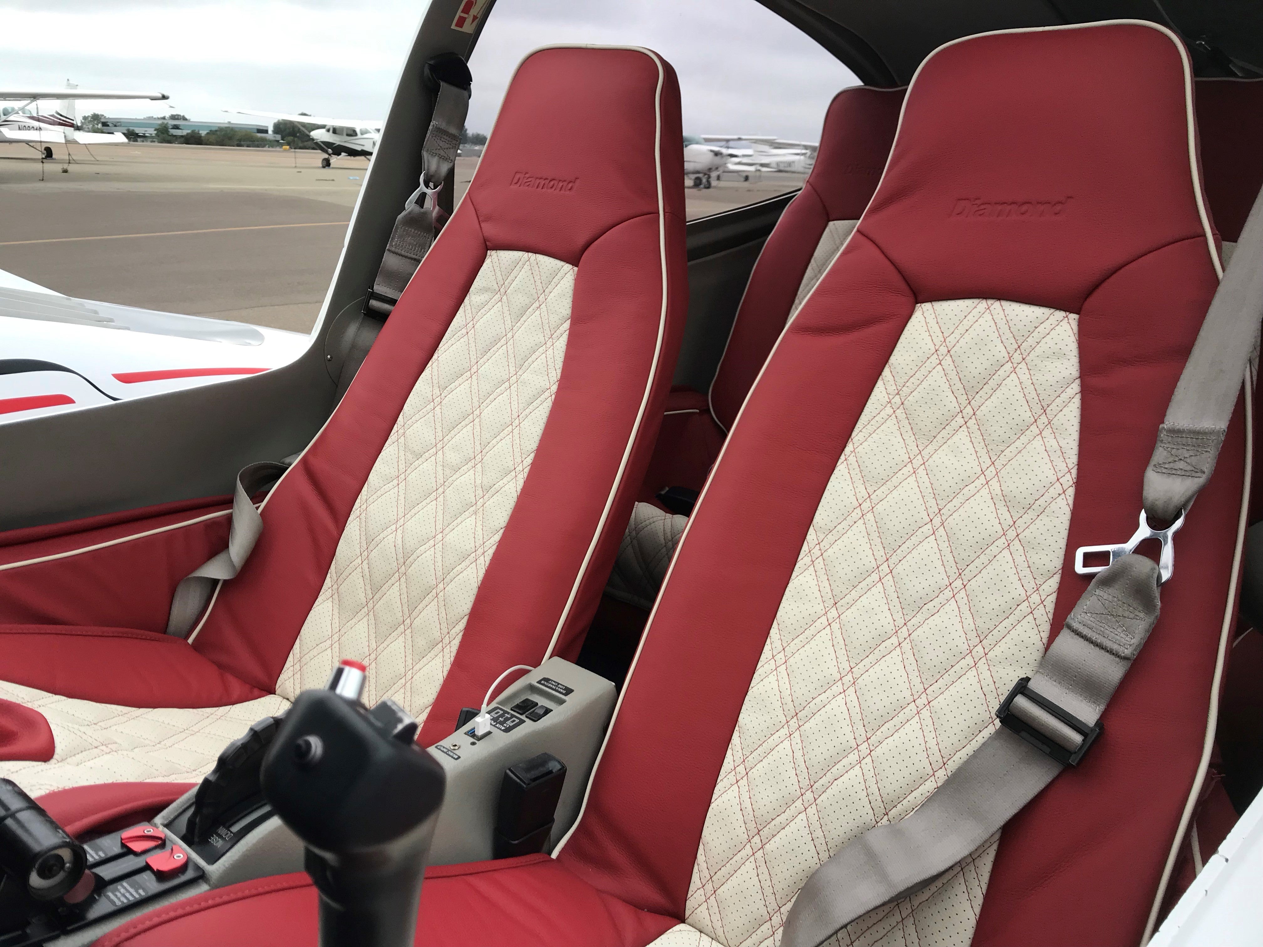 The standout feature of these seats is the vibrant Red (ADI-3011) leather, which creates a bold and modern look. To complement the bold red, the inserts are crafted from White (ADI-1021) leather, which is perforated (SP-1) for breathability and comfort. The centre insert is quilted with SA005 βDouble Diamondβ red stitching, adding a sophisticated touch to the seat design.The seats are framed with white piping, outlining the seat edges and inserts, providing a clean and defined look. The headrests are built into the seat backs, and the Diamond logo is embossed at the centre, showcasing the aircraft's brand and attention to detail.