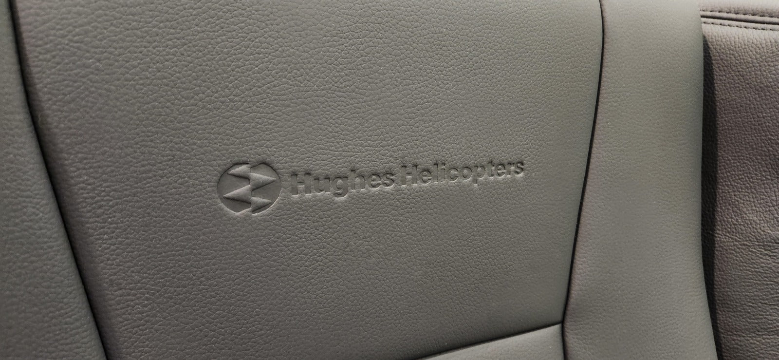 Logo Embossing: The Hughes Helicopters logo is embossed on the upper backrests of the two outboard seats, adding a touch of branding and elegance.