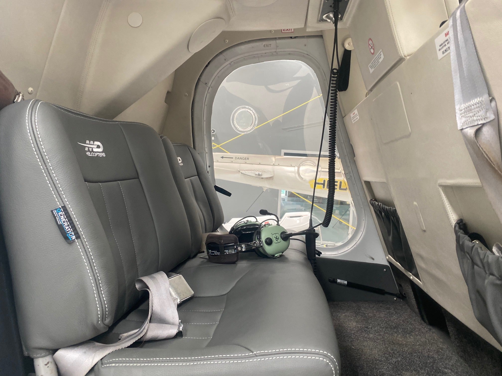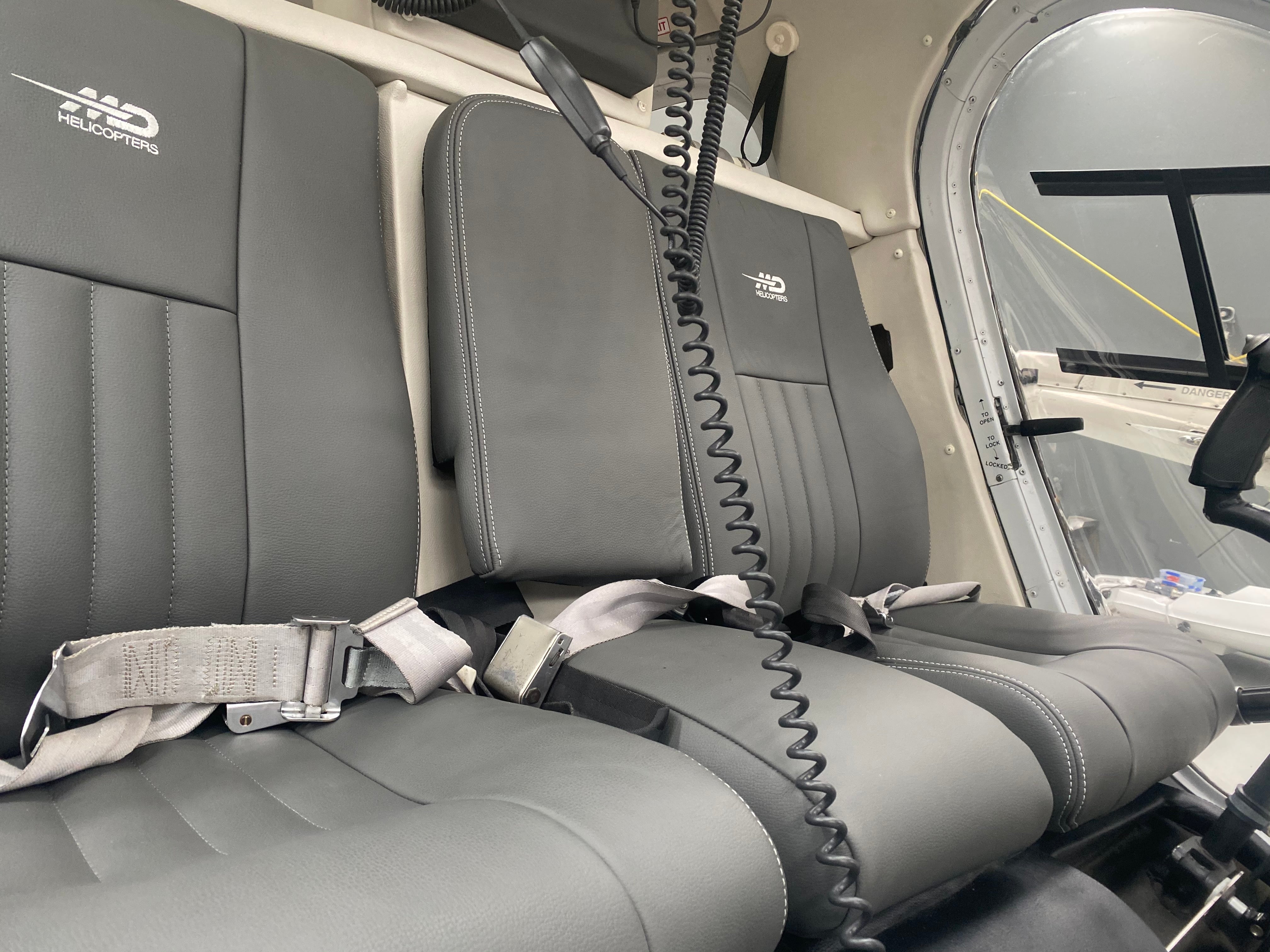 MD Helicopters logo embossed on seatbacks (excluding the narrow center seat)