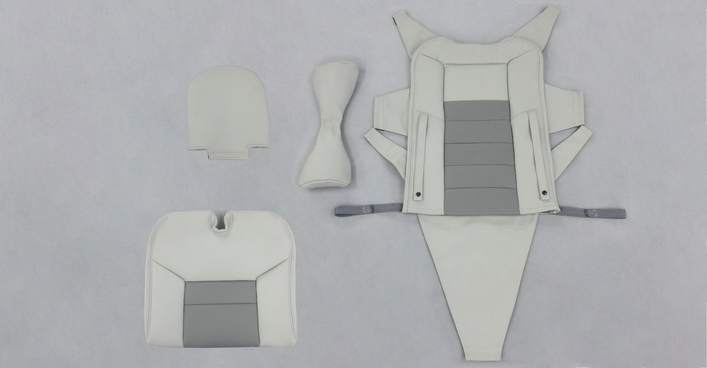 The MD 902 helicopter features two slung crew seats, and our solution ensured that the new seat covers fit perfectly while maintaining the OEM crash-tested cushions. The seat base attaches conveniently to a base plate using velcro straps, while the back covers are securely fastened onto the seat frame with velcro. The headrests are included in the kit, and they also feature velcro attachments to secure them around the frame.