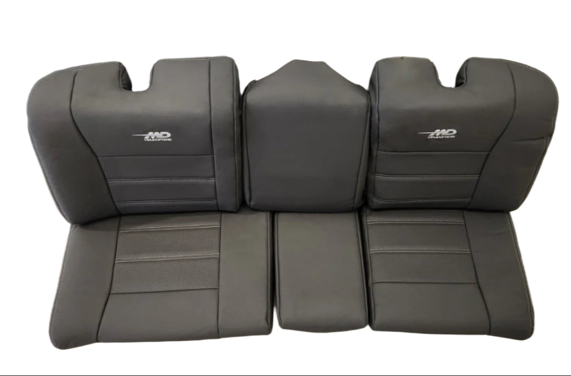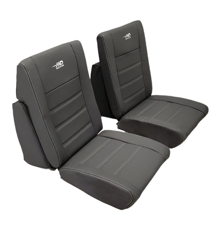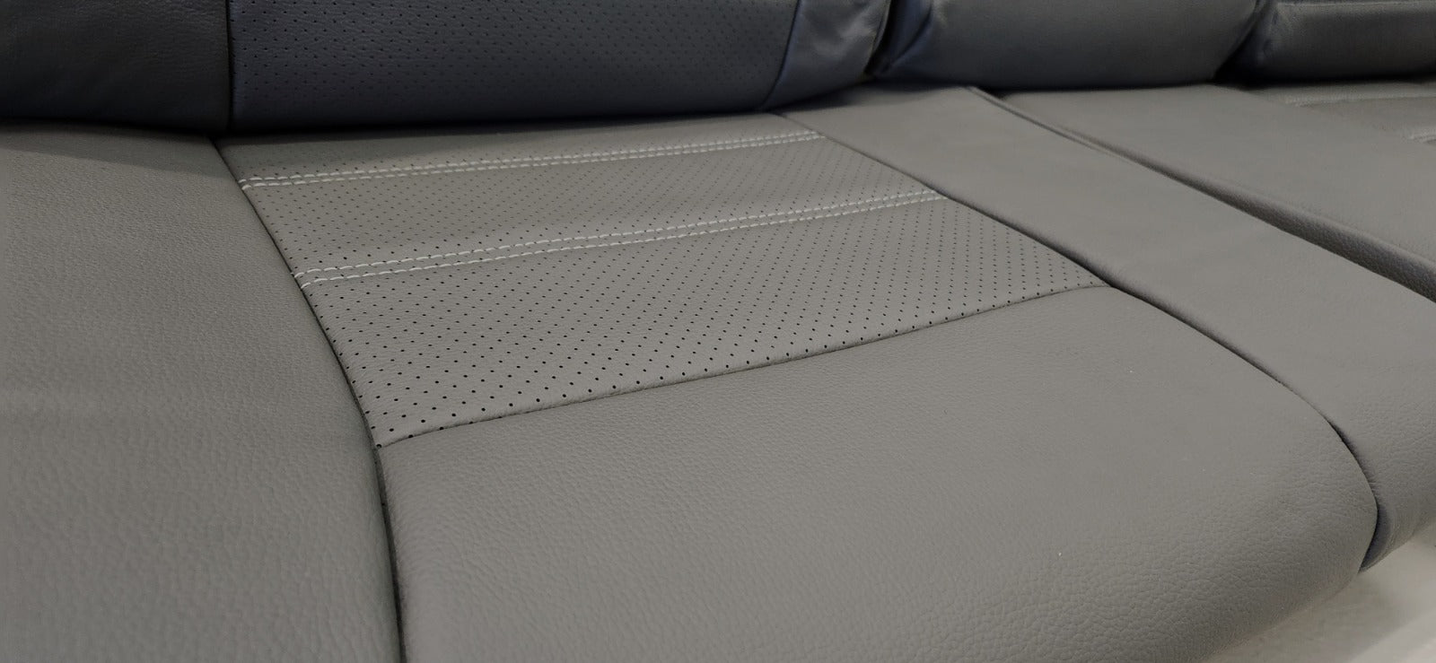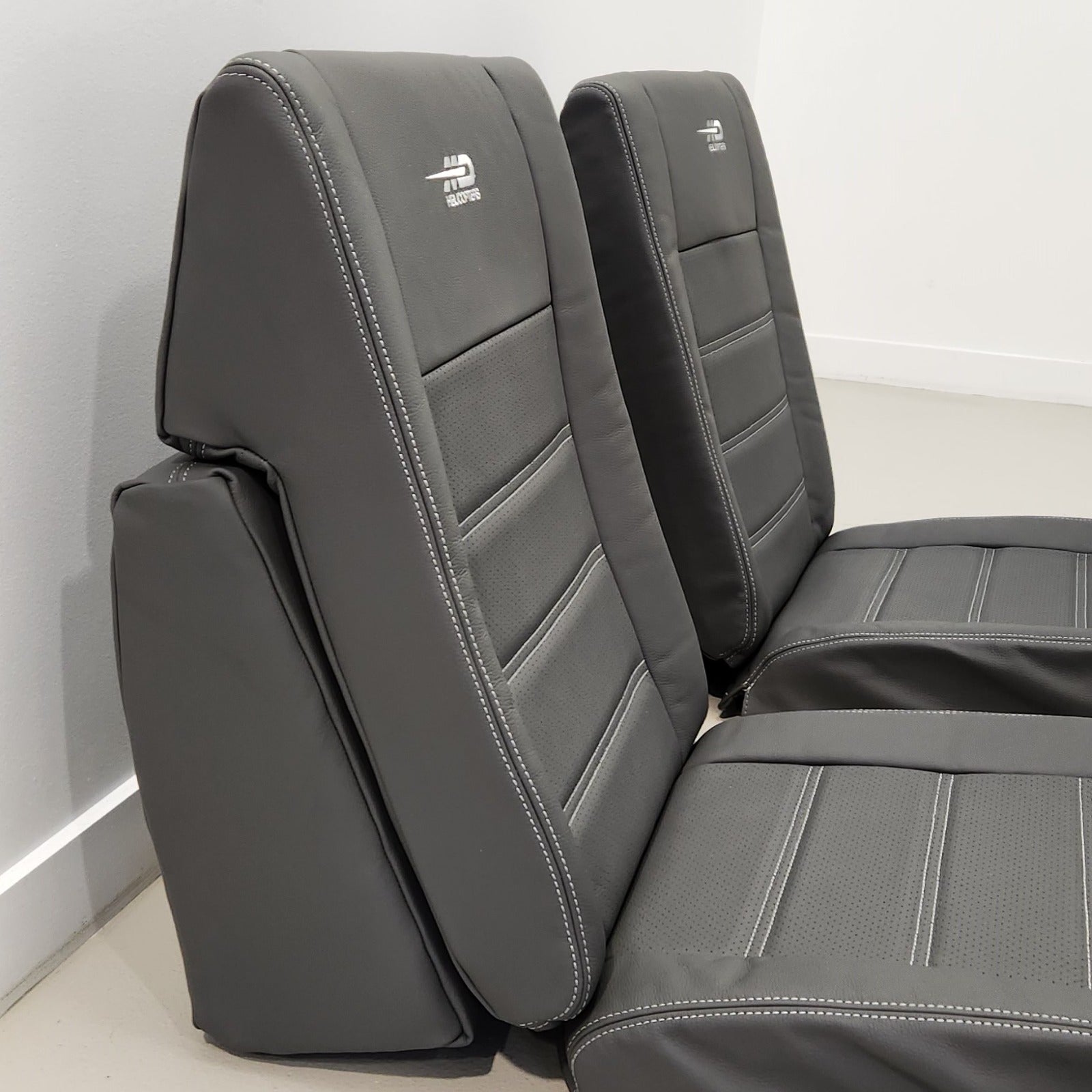 The seat dress covers are made from charcoal grey leather (ADI-1121) and feature silver decorative stitching. The MD logo is embroidered on the seat backrests in matching silver thread. The seat inserts are perforated leather, with three horizontal feature lines stitched into the panel for added texture and style.