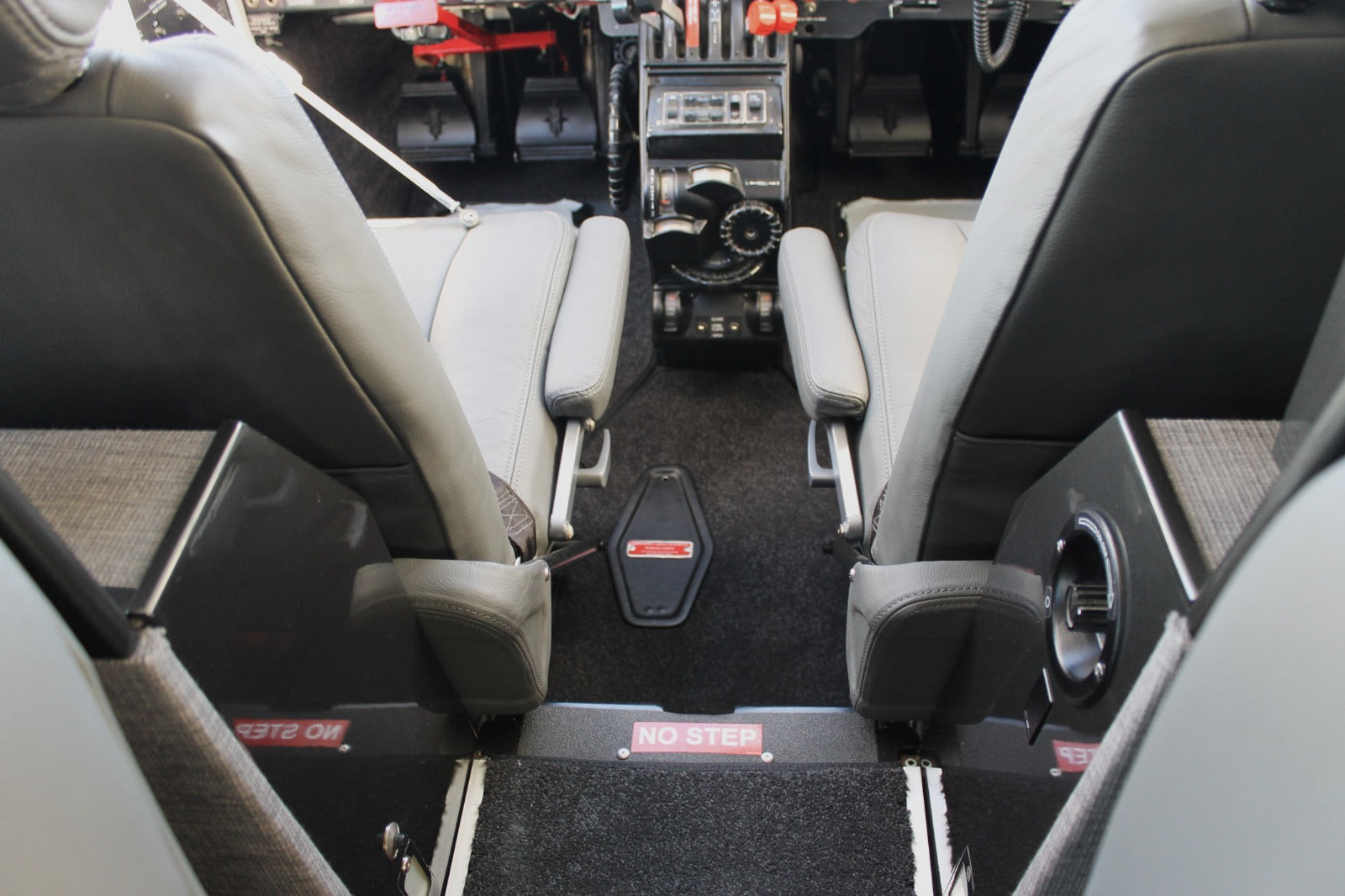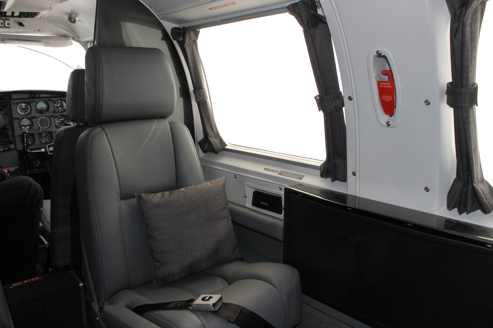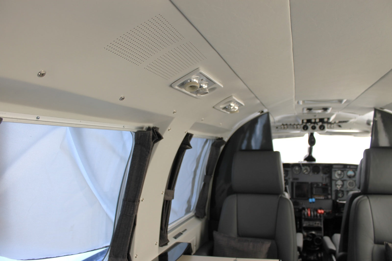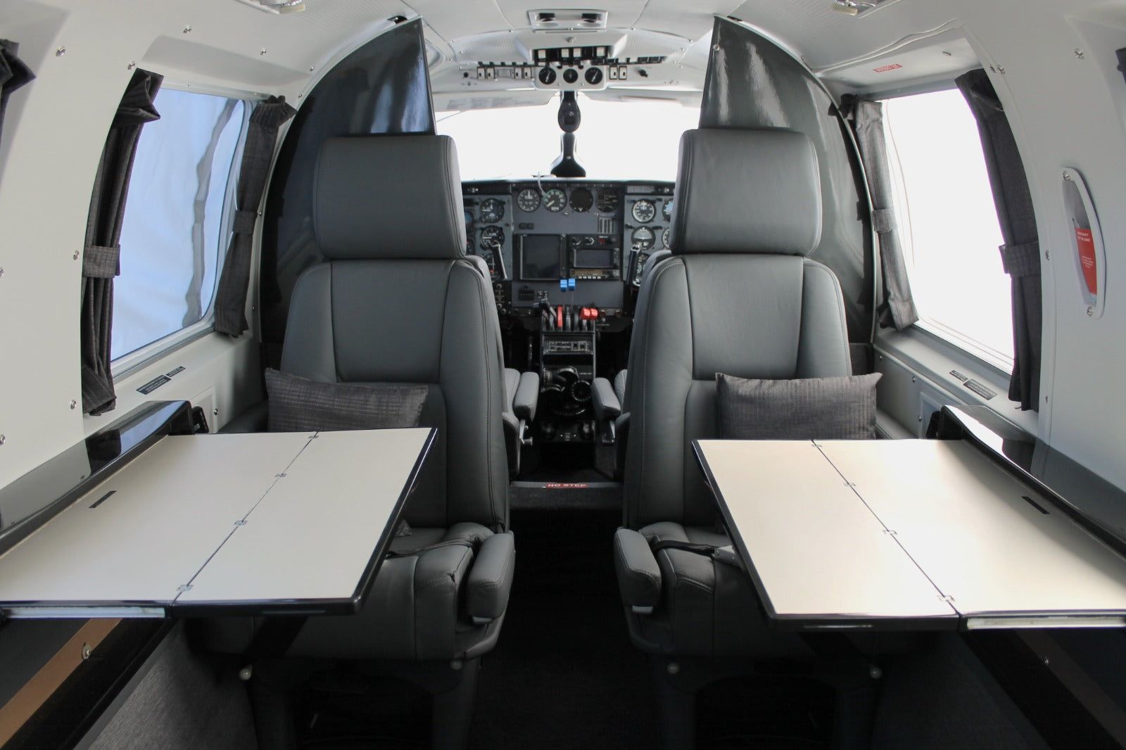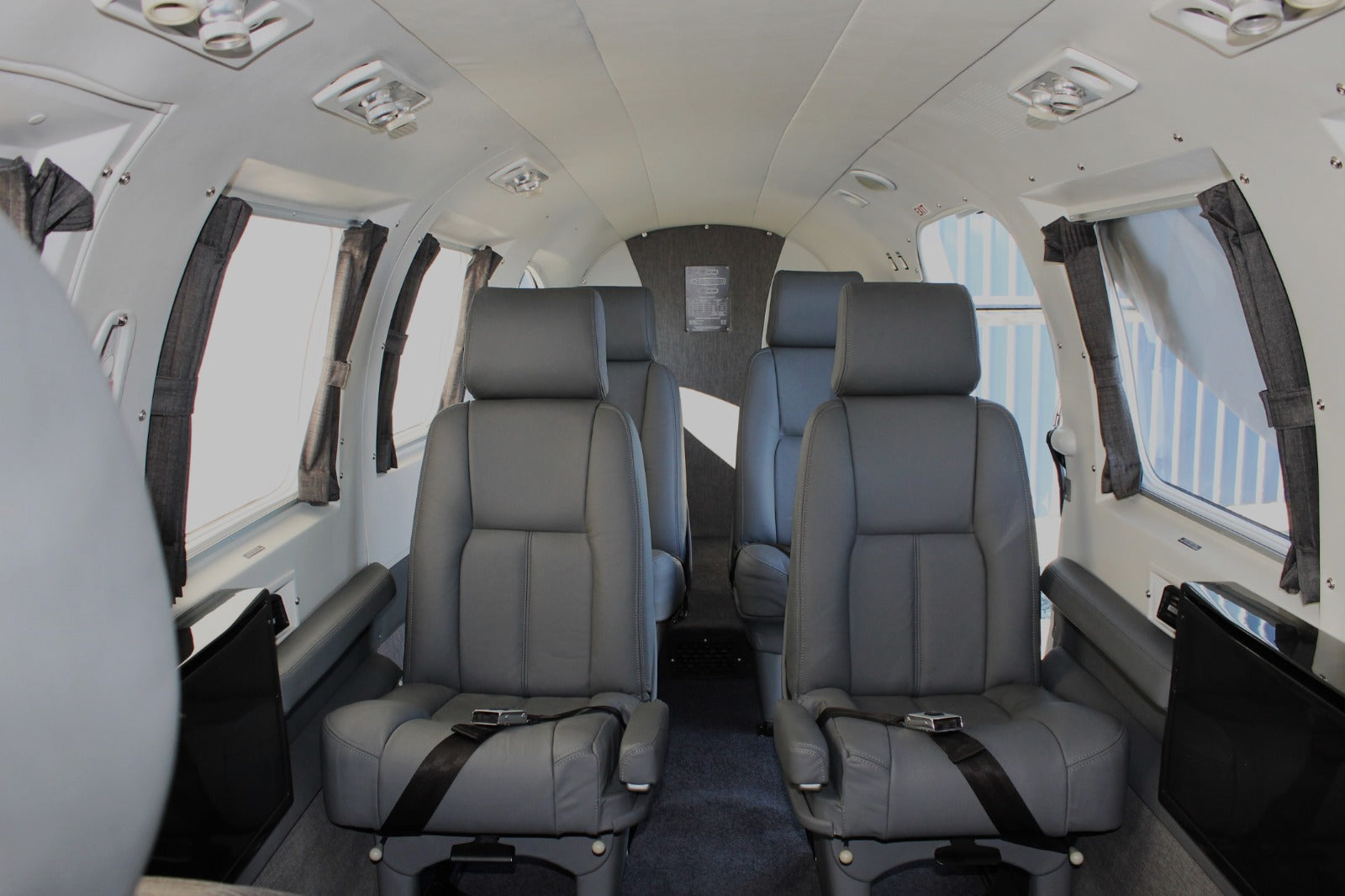 The Piper Navajo C/R cabin now reflects a thoughtful blend of bold modern tones with refined craftsmanship. The charcoal grey theme delivers a sophisticated, contemporary atmosphere, while light upper linings and cabinetry provide contrast and a sense of spaciousness. Every elementβfrom the leather seating to the smallest door sealβwas carefully considered and expertly executed to ensure a seamless, luxurious, and durable finish.