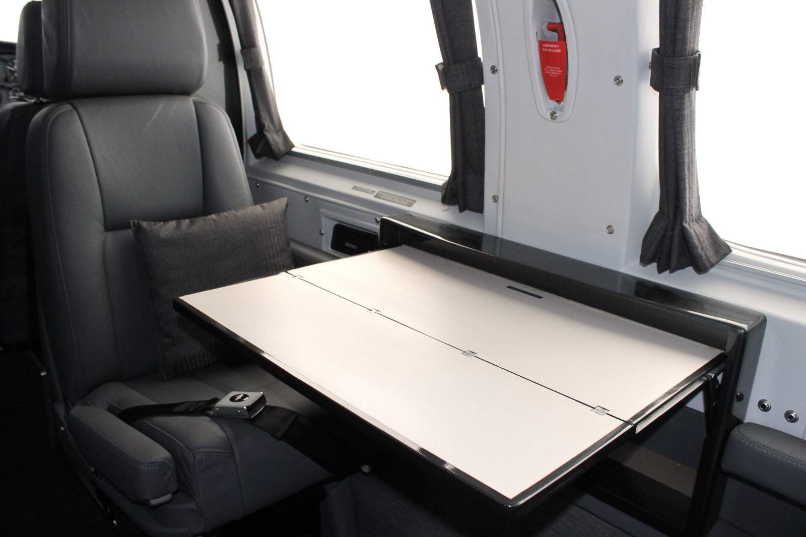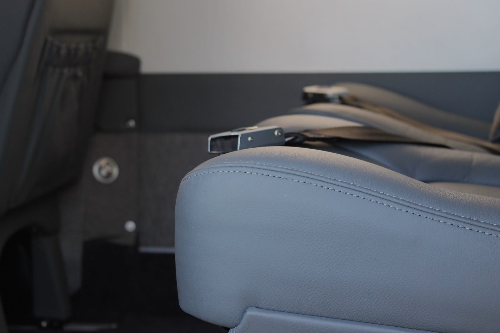 Ceiling panels and the rear bulkheadβs upper section were wrapped in Oxford white vinyl, creating a bright, airy feel above the armrest line.