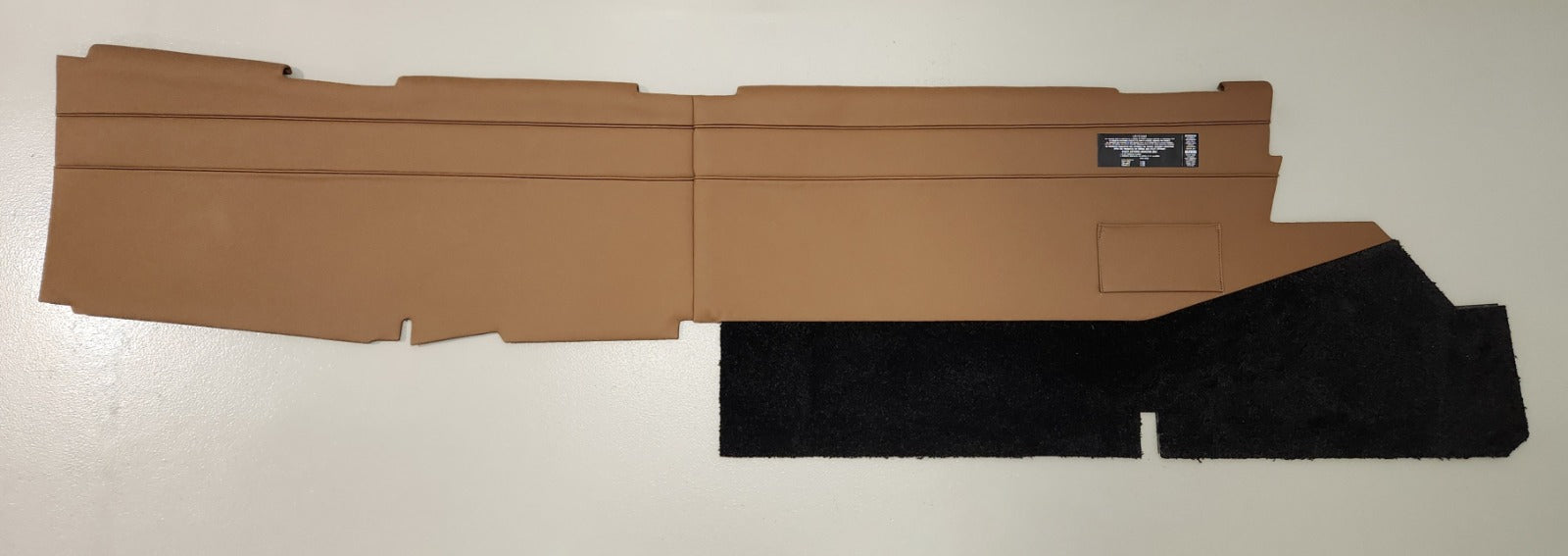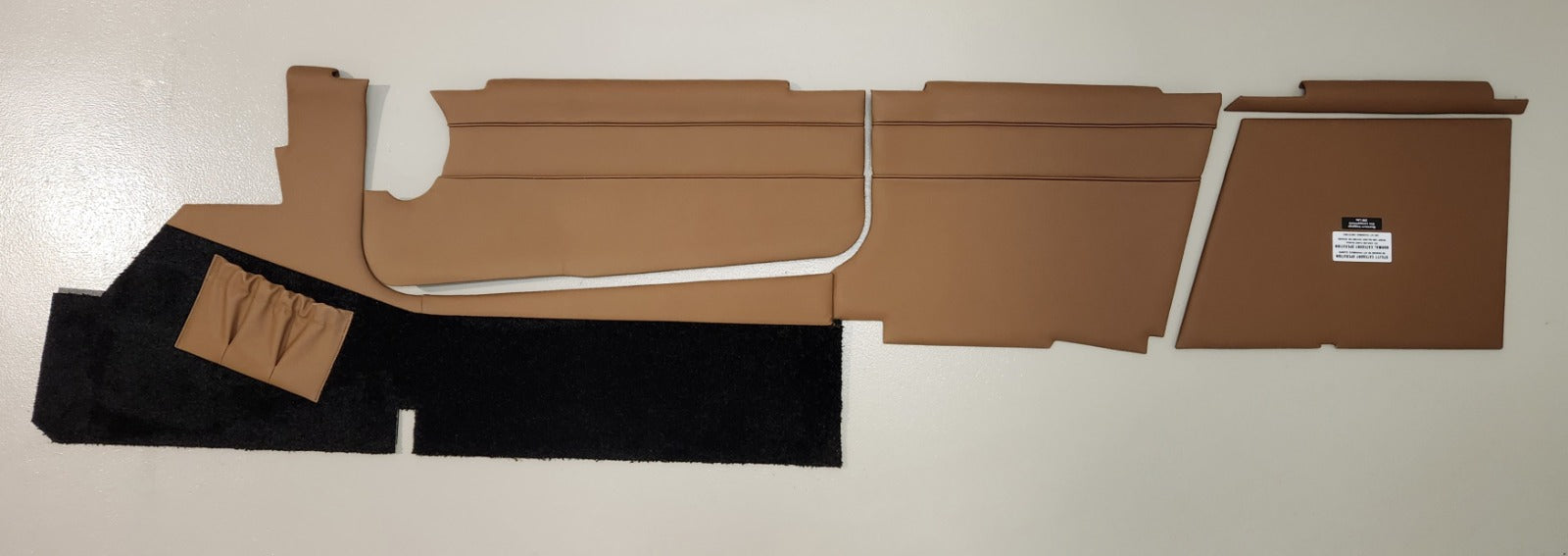 For the sidewall trim panels, the main upper section was covered in saddle brown leather (ADI-4111), providing a warm and inviting feel. The lower section of the sidewalls was finished with Blackcity carpet, maintaining a uniform look throughout. The sidewall upholstery features two parallel lines of piping running horizontally across the aircraft, enhancing its sleek design. Additionally, the sidewall panels include practical pockets on both sides—one forward of the door and another on the upper sidewall, adding extra functionality to the design. Each sidewall panel was supplied with the appropriate decals to make the installation process as easy as possible.
