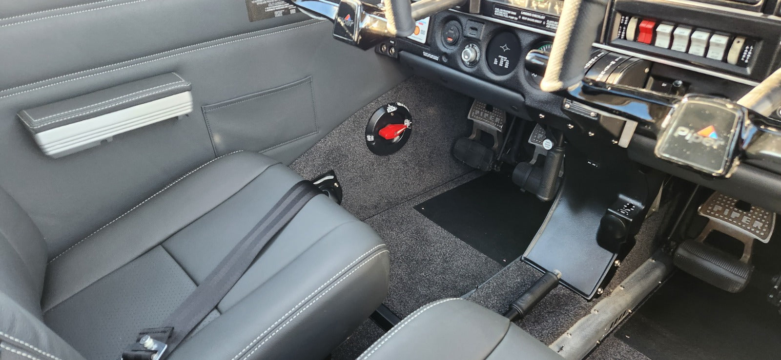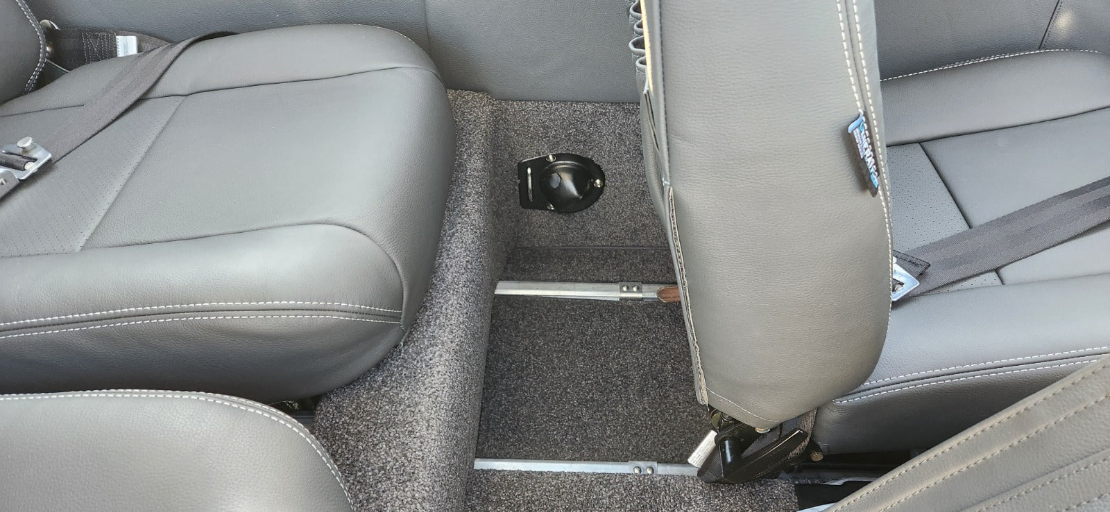 For the floor coverings, we chose Genflor Ash carpet (WN-120), known for its durability and sophisticated look. The same carpet was used on the bottom of the sidewall panels, creating a cohesive design. The upper sidewalls were covered in lead grey microfiber leather, which matched the seats. To add further detail, the sidewalls were finished with two lines of double stitching in silver thread, providing an extra layer of refinement. The wall-mounted armrests were styled to match the sidewalls, ensuring a seamless integration.
