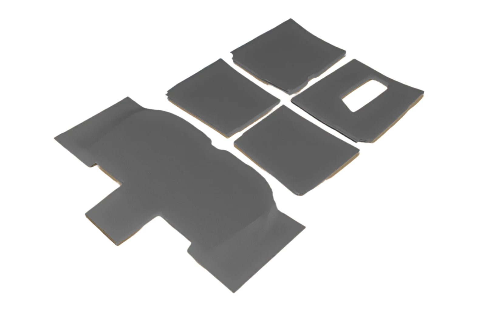 The floor coverings are made from a dark grey (Zimmer WN-120) nylon cut-pile carpet, with custom cut-outs for floor heaters on both the left and right-hand sides to ensure functionality alongside aesthetics.