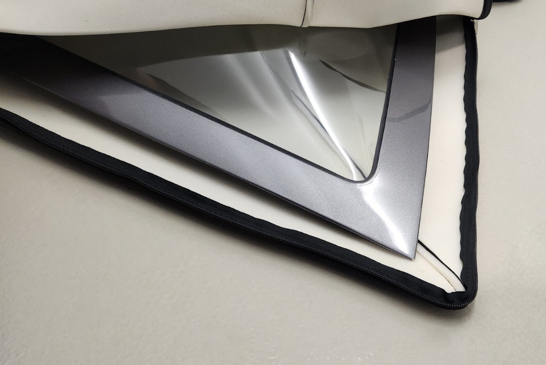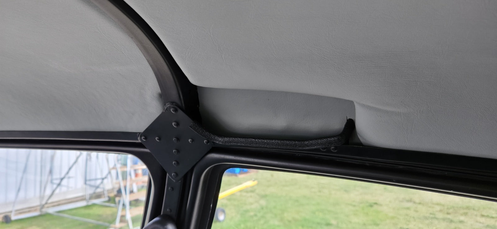 The color scheme for the interior features a mix of darker greys for the seating, door inserts, and carpets, and lighter greys for the headlining and bulkheads. The headlining and bulkheads were wrapped in sea spray vinyl for easier cleaning compared to traditional fabric.