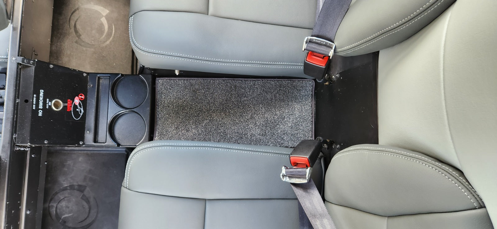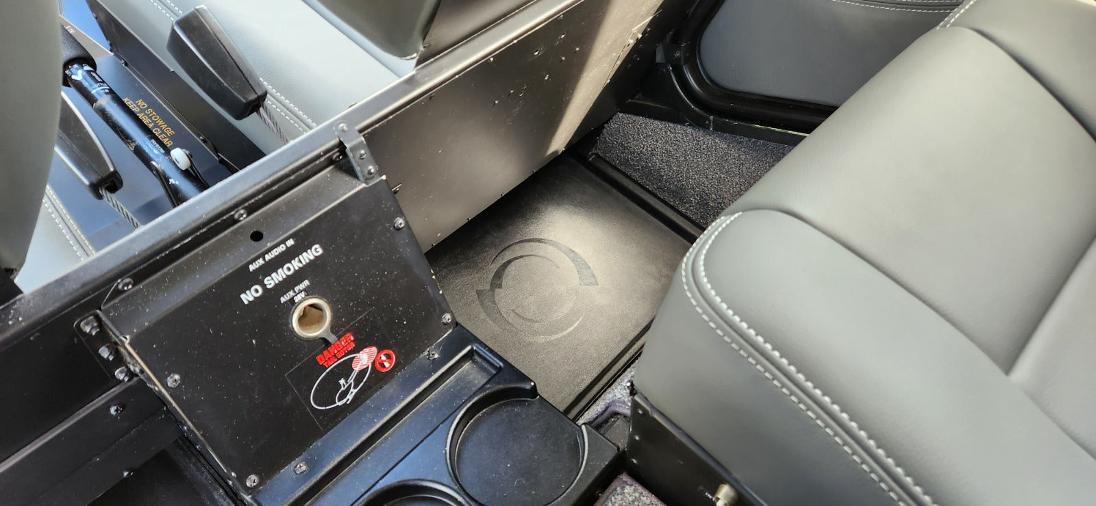 Floor coverings are made from iron-colored carpet, covering the lower outboard sidewalls and the front faces of the seat pedestals. Composite floor trays are fitted to protect the carpet during heavy-duty use.