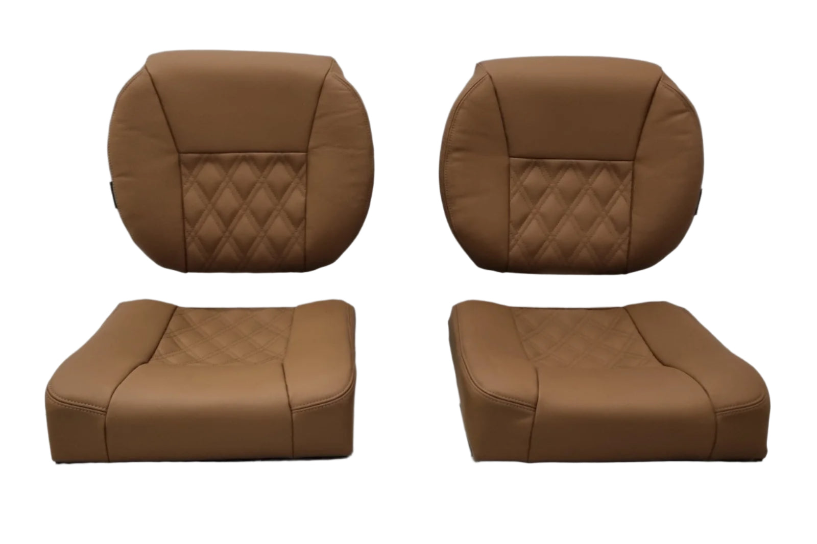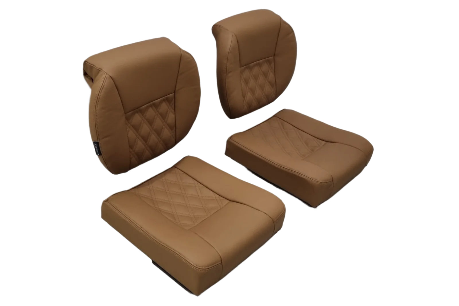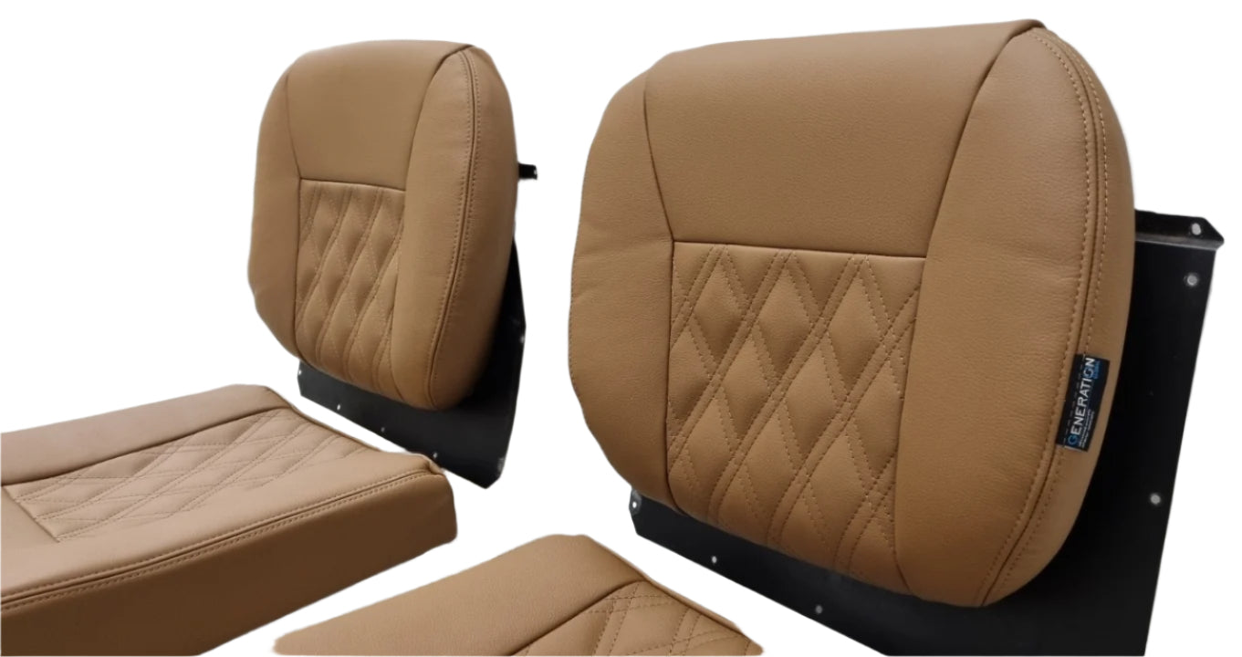 The seat covers and cushions were based on the Generation II style, tailored to fit the existing seat pans. The upholstery was crafted using saddle brown leather (ADI-4111), which offers a rich and sophisticated look. The inserts were quilted in a double-diamond pattern, with all stitching done in a thread that matched the leather's color, providing a seamless and elegant finish. Additionally, the same saddle brown leather was used to create collective and cyclic control boots, ensuring consistency throughout the interior. -