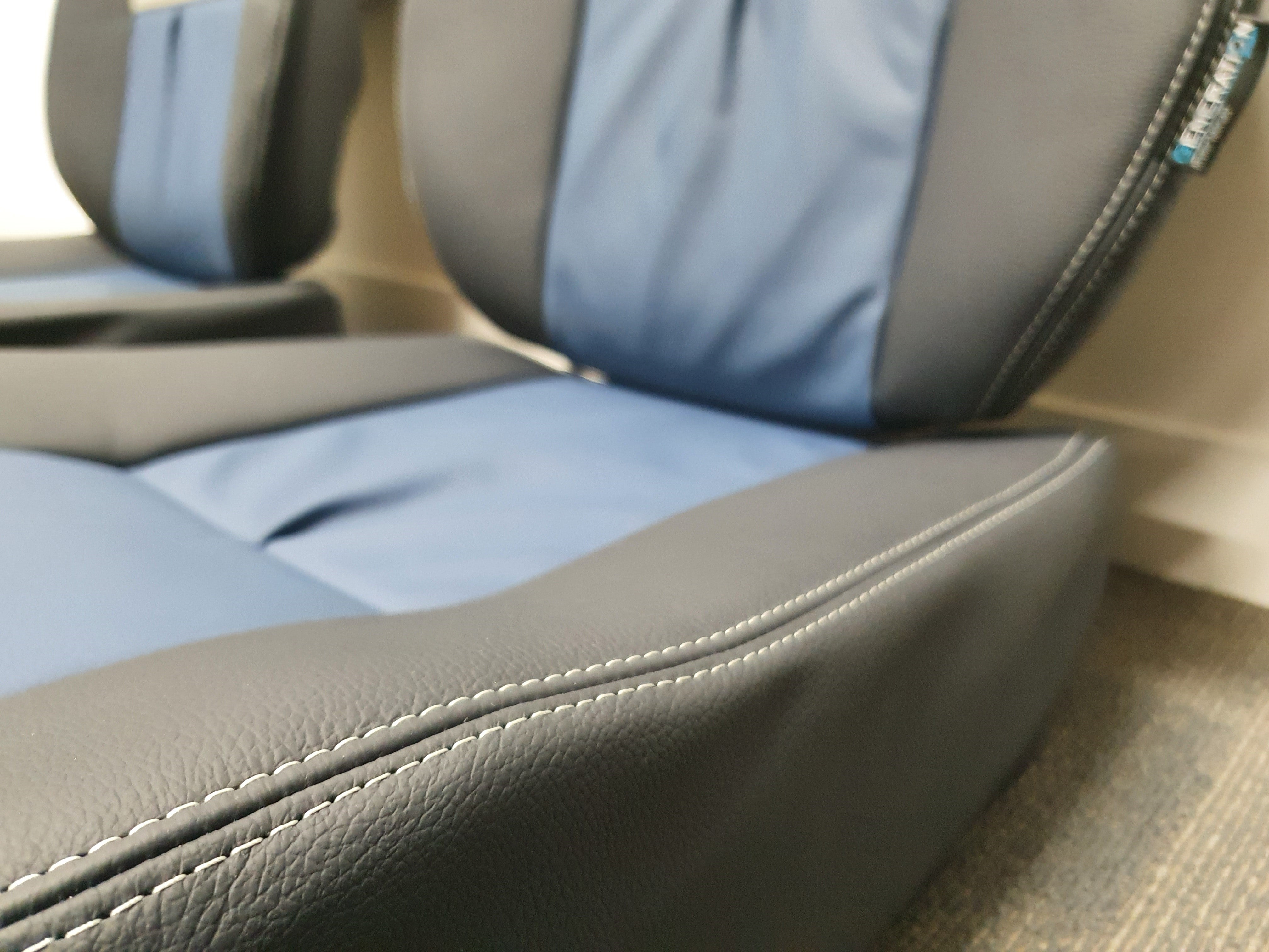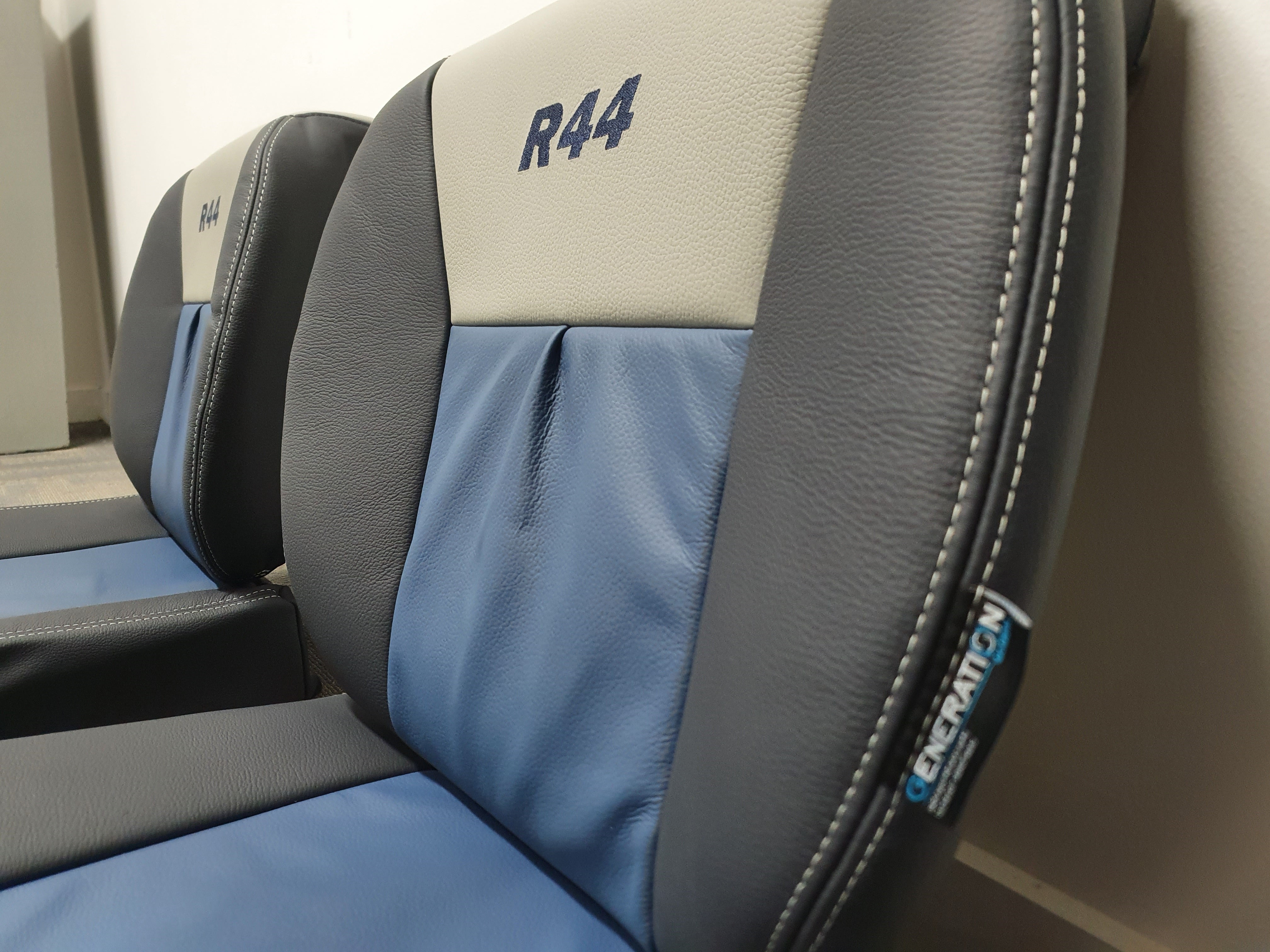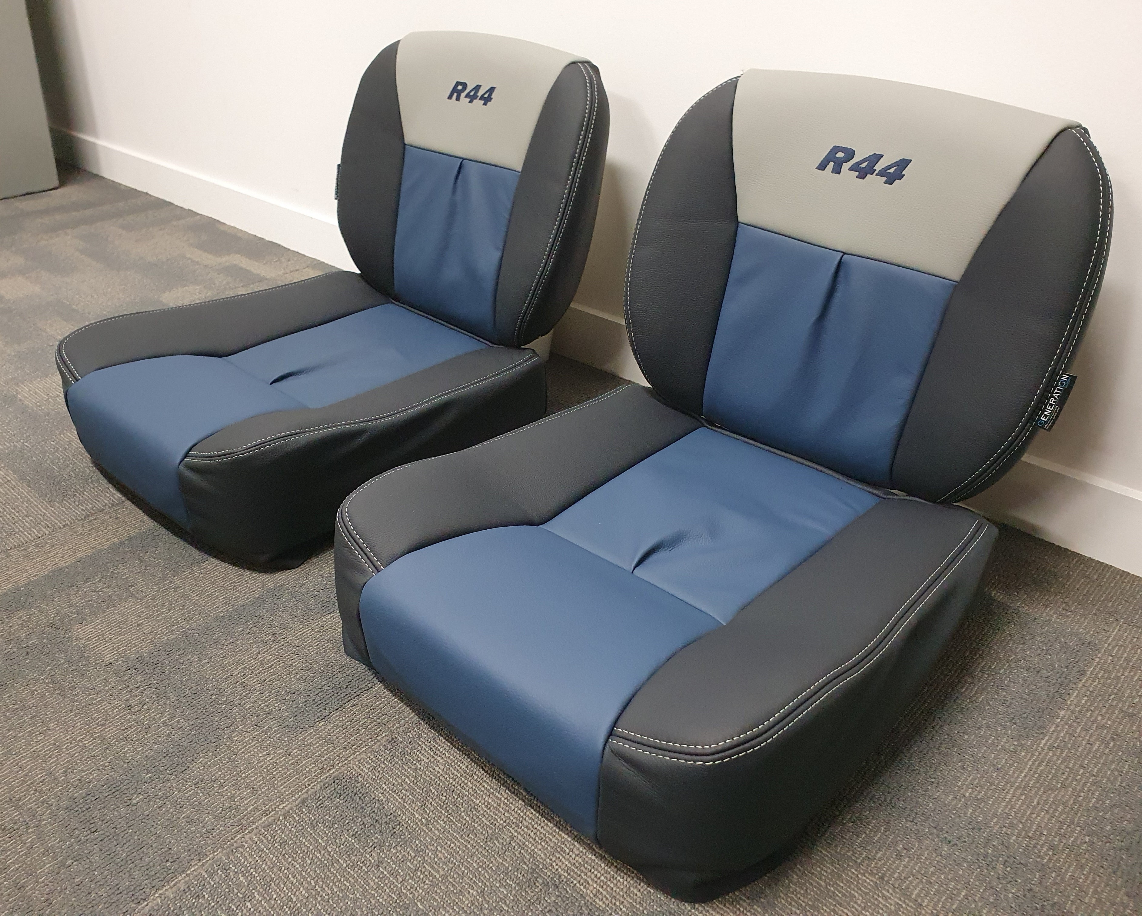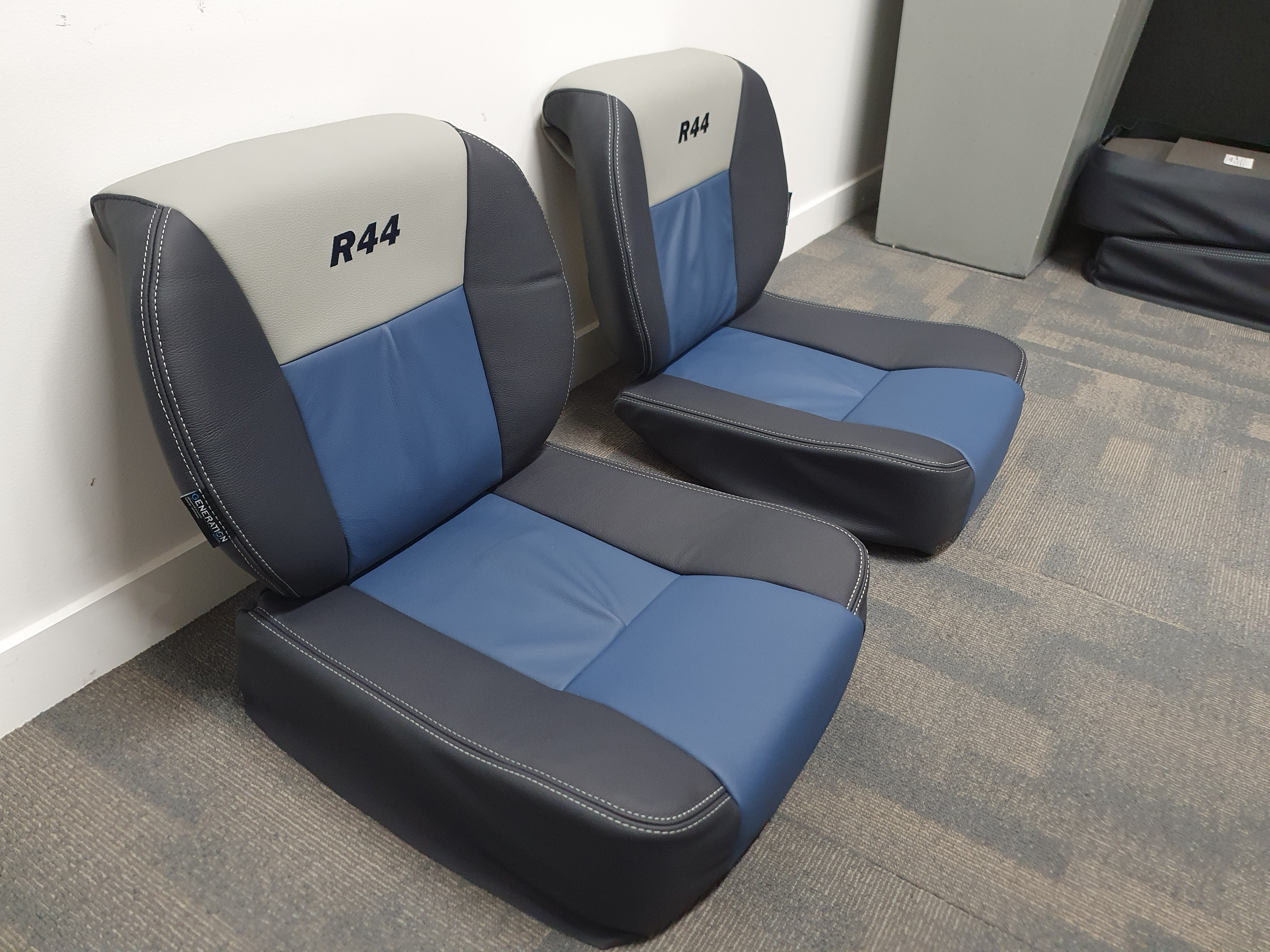 Seat Covers and Cushions: The seat covers were designed with Generation II styling and made from high-quality aviation leather. The main color was Navy Blue (ADI-2031), complemented by Royal Blue (ADI-2031) inserts and Titanium Grey (ADI1231) headrest highlights. Decorative Titanium Grey stitching was used to enhance the design, and the R44 Logo was elegantly embroidered in Navy Blue thread, adding a personalized touch to the interior.