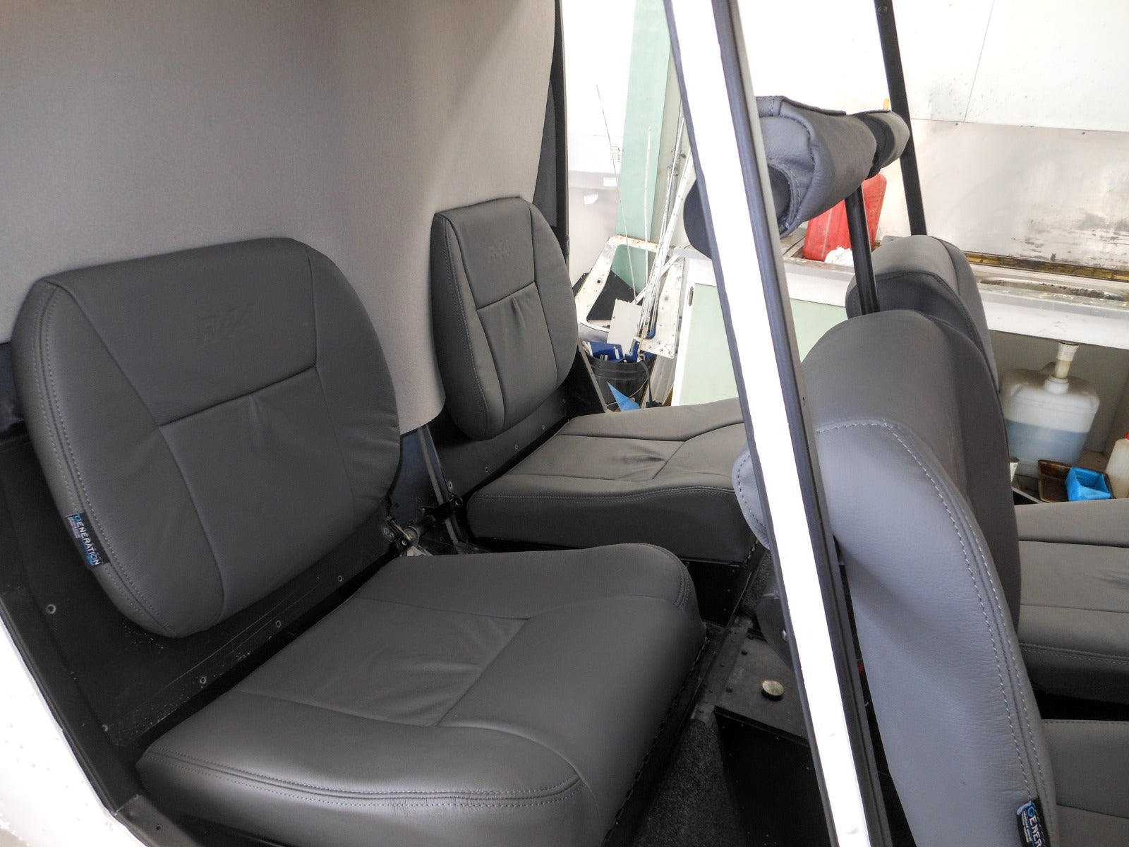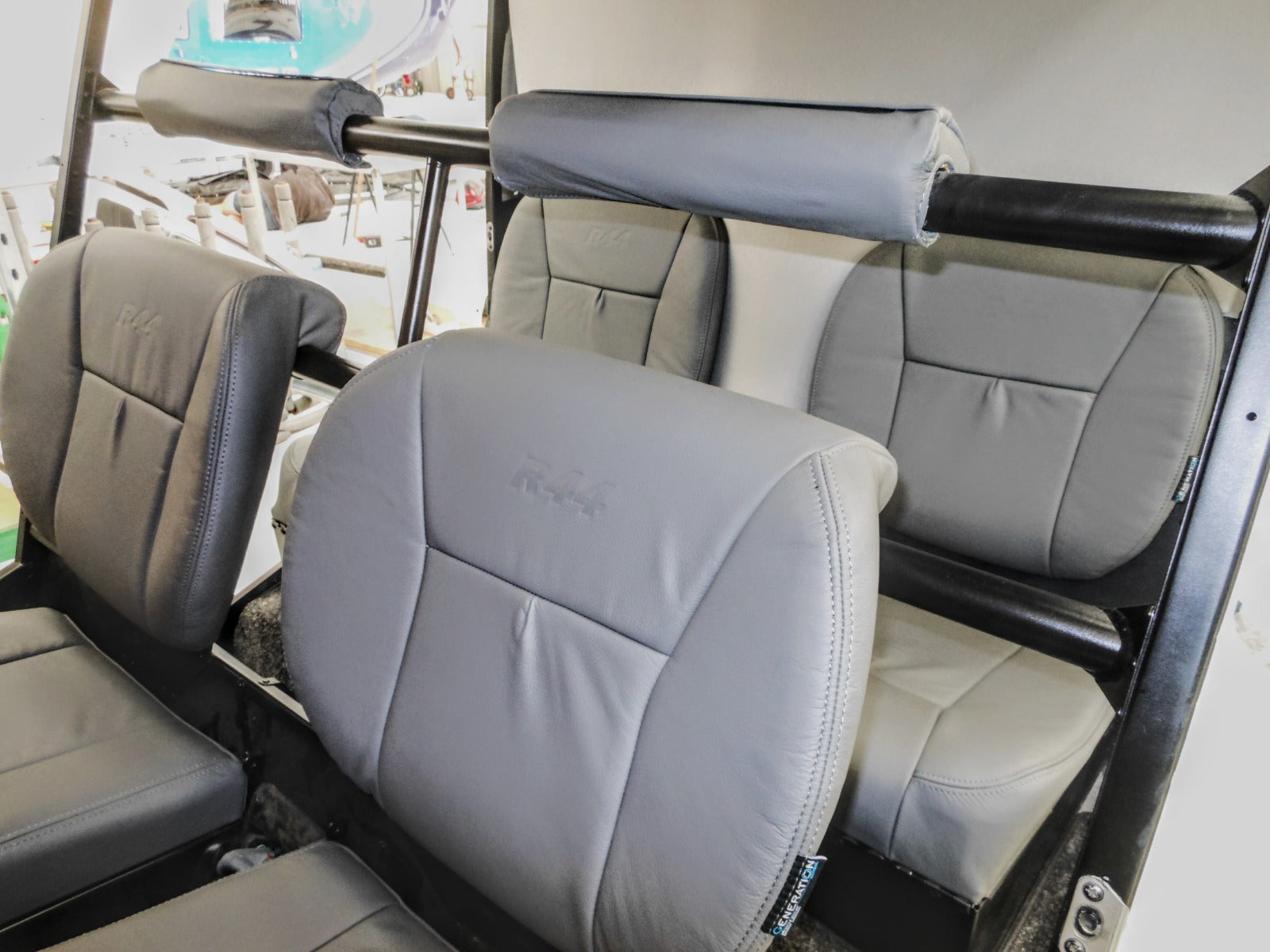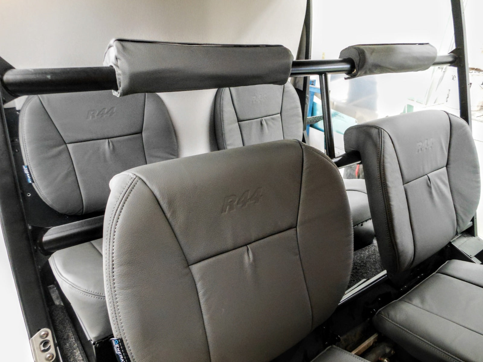The R44 seats were reupholstered with Charcoal Grey leather (ADI-1121), offering a sleek, durable finish that enhances both comfort and safety. We used a Generation II seat design, which is known for its superior ergonomics. As a special touch, we carefully embossed the R44 logo onto the backrests of four seats, adding a personalized and premium element to the helicopter's interior.
