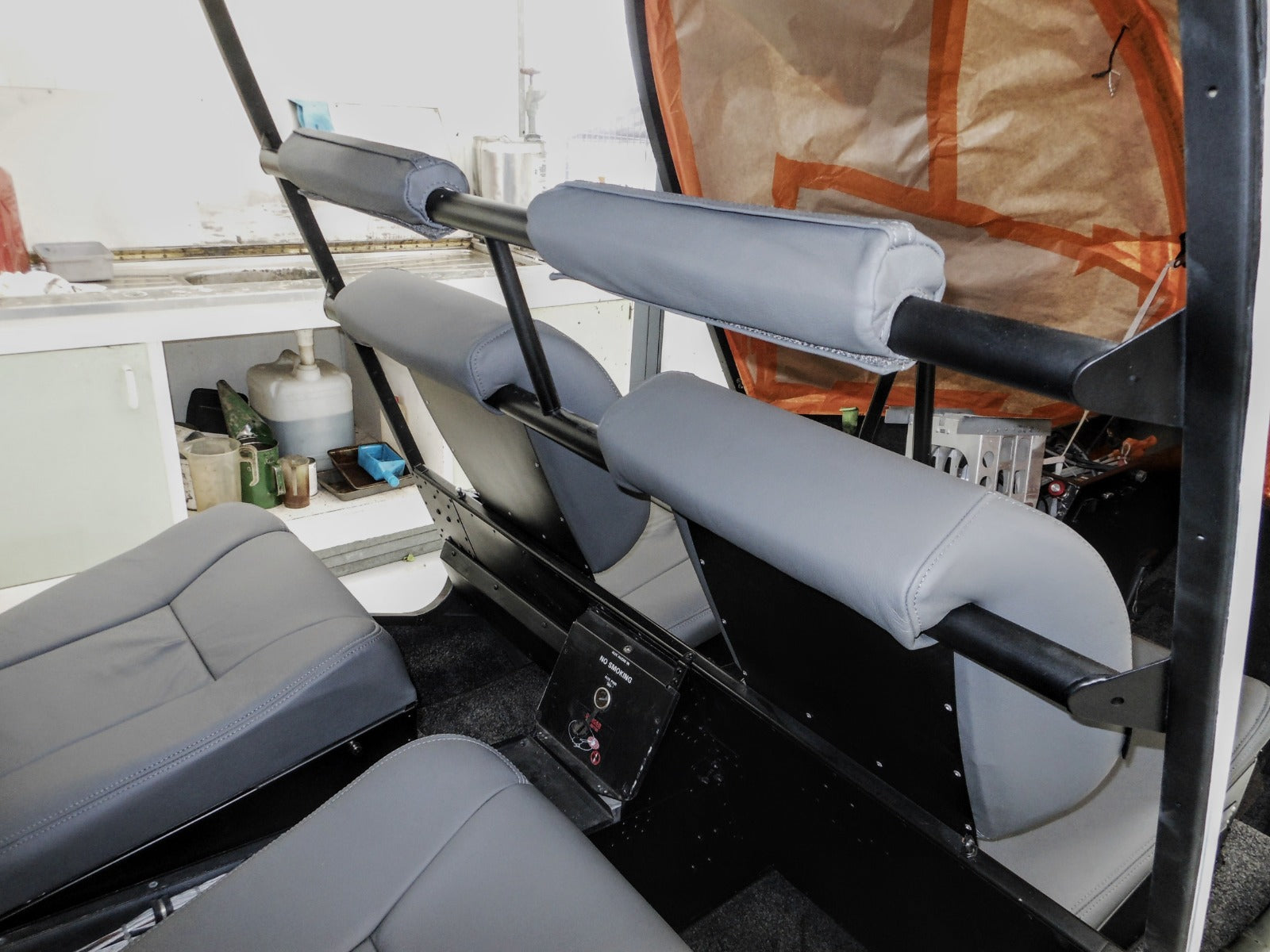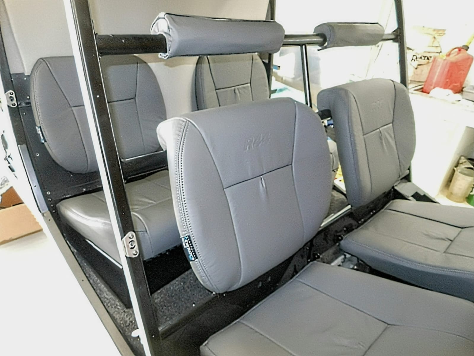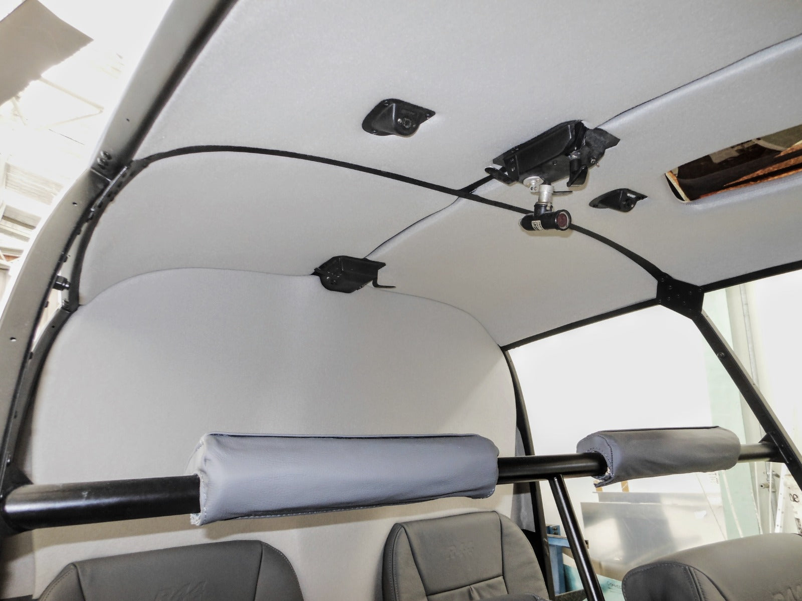 To protect passengers, we installed soft crash rail covers on the head-height rail behind the front passenger seats. These covers are foam-lined, providing added safety by acting as a cushion in the event of sudden movement. The covers are thick enough to double as a headrest, ensuring both safety and comfort for passengers.