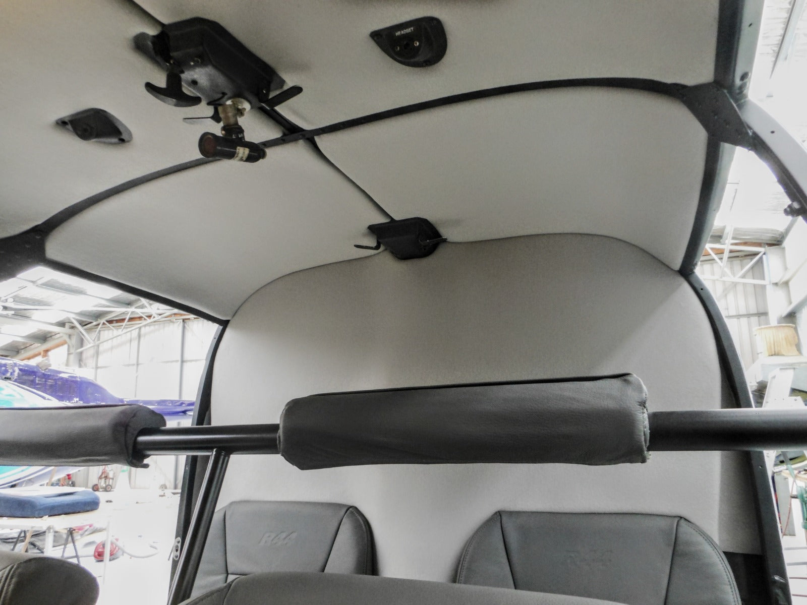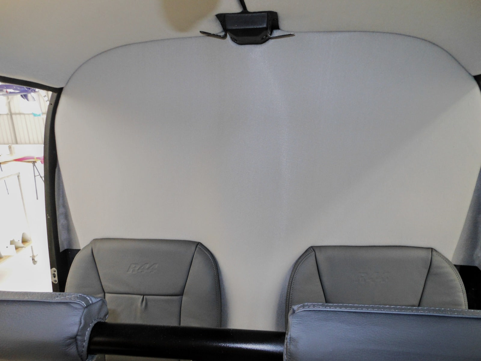 We provided a custom headlining made from foam-backed fabric, in a light opal color. Unlike many standard headlinings, this one is clean and simple, without cutouts for air conditioning or handholds. The seamless design contributes to a smooth and uncluttered look, adding to the modern appeal of the R44βs cabin.