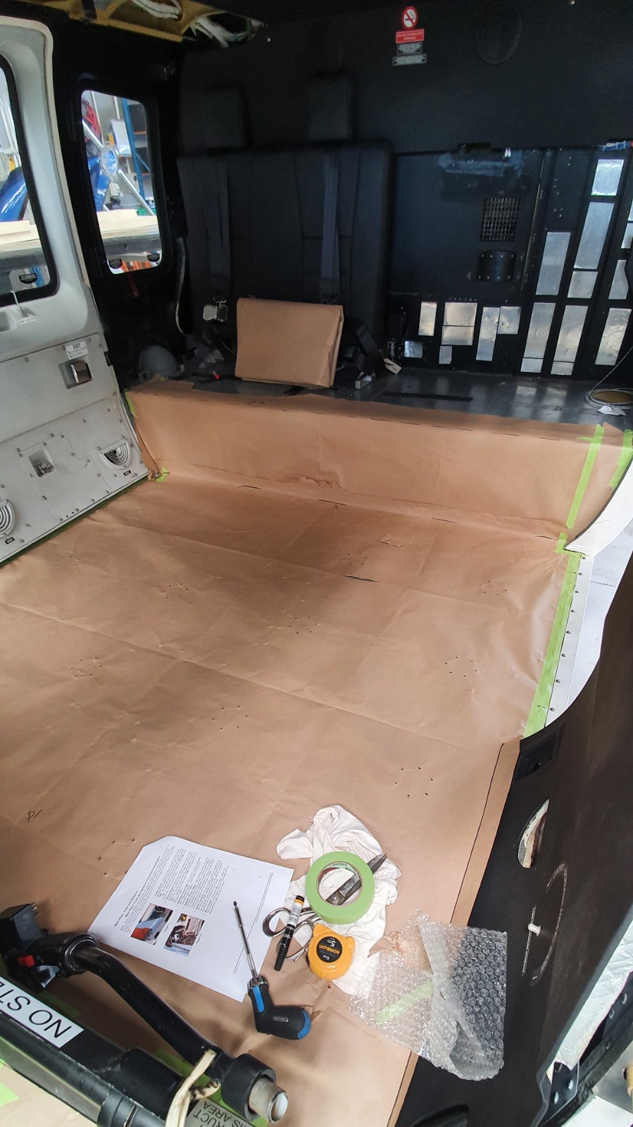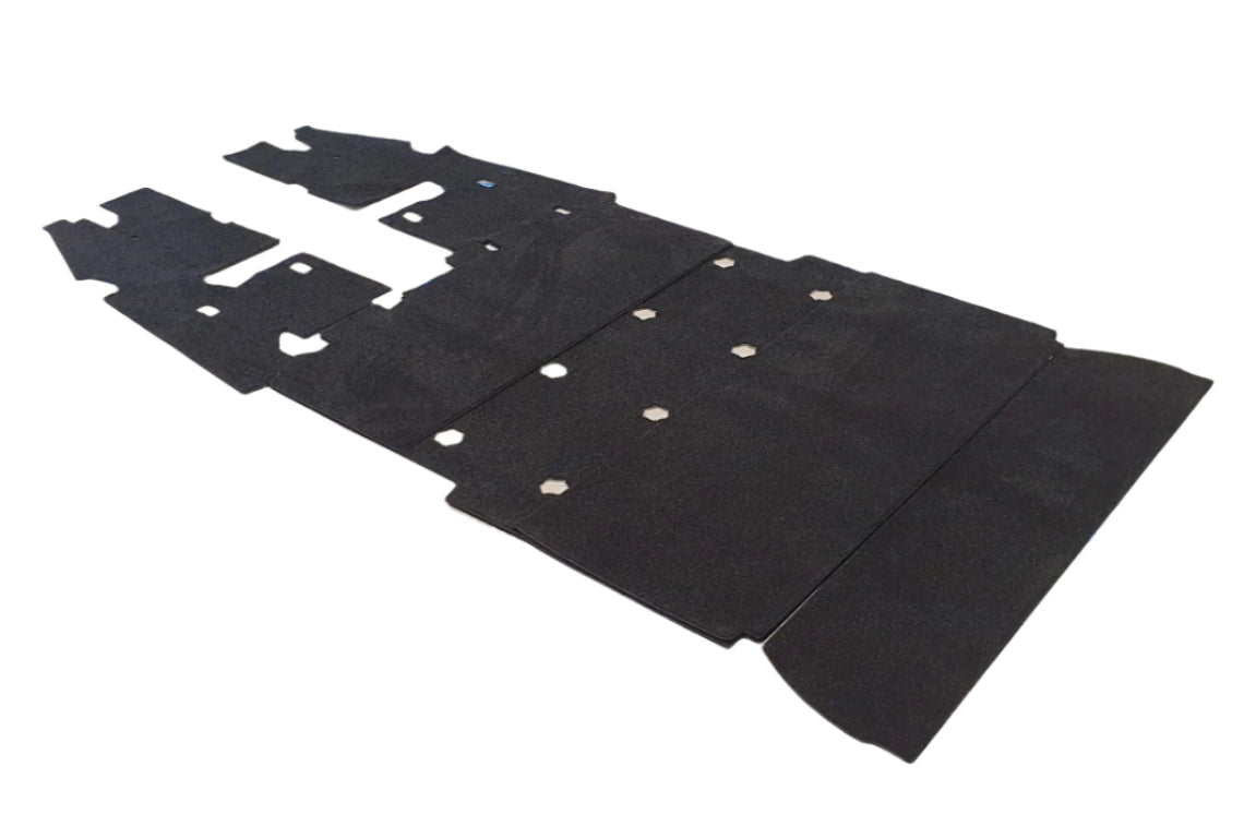 The floor coverings were completely replaced, and new Genflor Black City carpet was installed throughout the cabin. The edges of the carpet were bound with black mesh for durability and a professional finish. To further protect the new carpeting, additional carpet overmats were provided for the rear cabin, preserving the aesthetic and functionality of the floor.