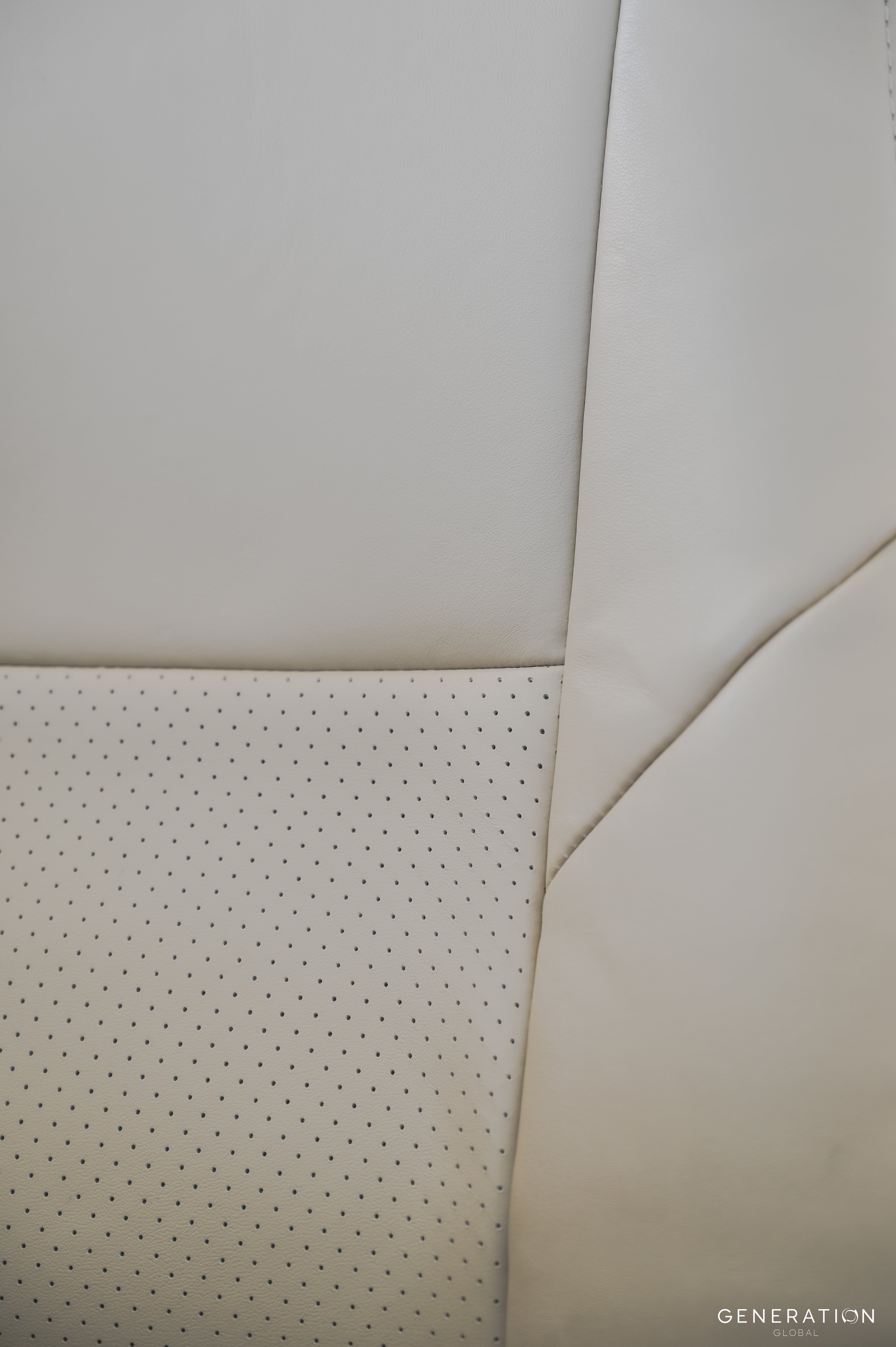 The seats were completely reupholstered in Samt Beige Nappa Leather, giving the cabin an elegant, luxurious appearance. Known for its soft finish and durability, Nappa leather provides both style and comfort. The seat inserts were carefully perforated, adding a sleek, modern touch to the design while ensuring breathability for long flights.