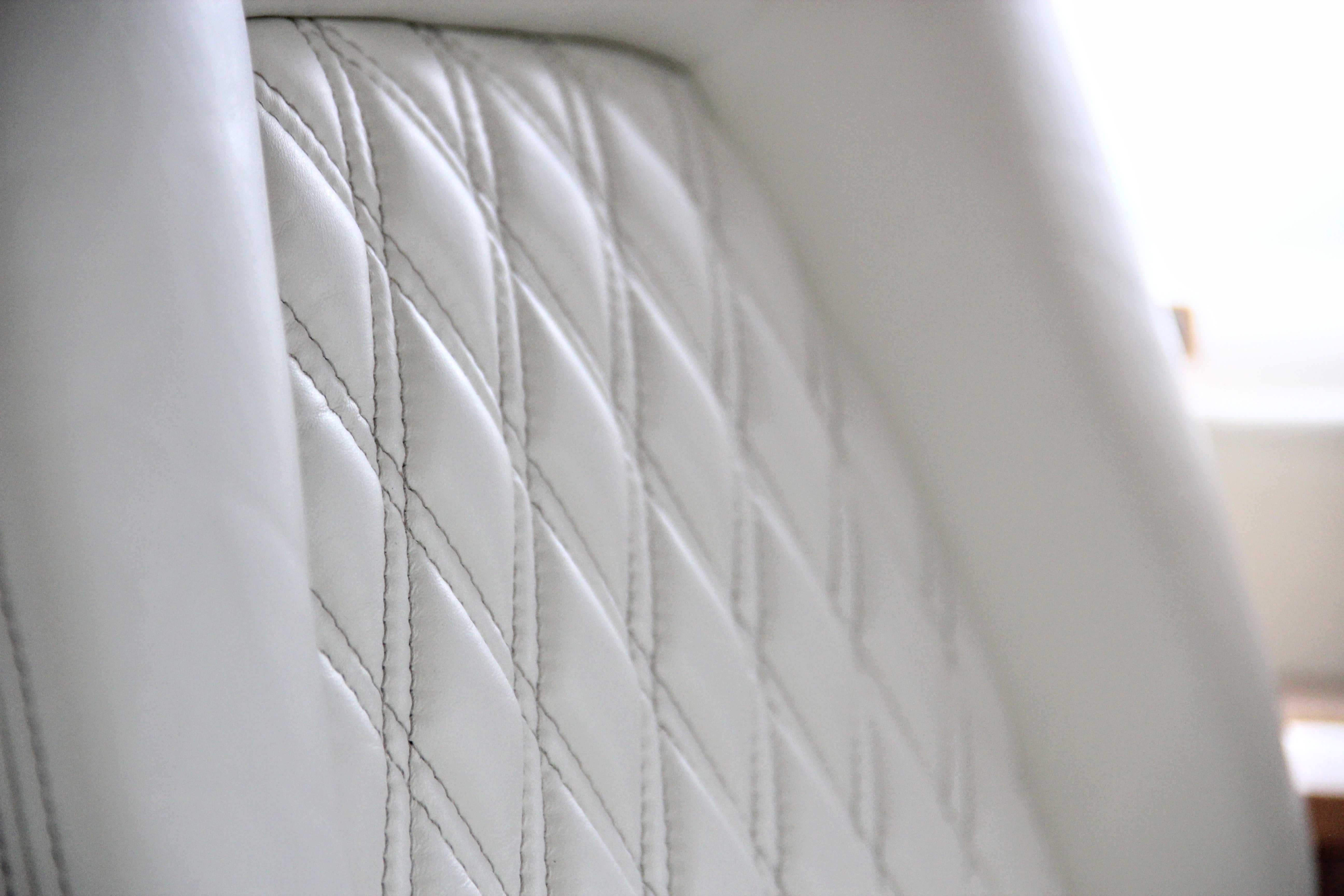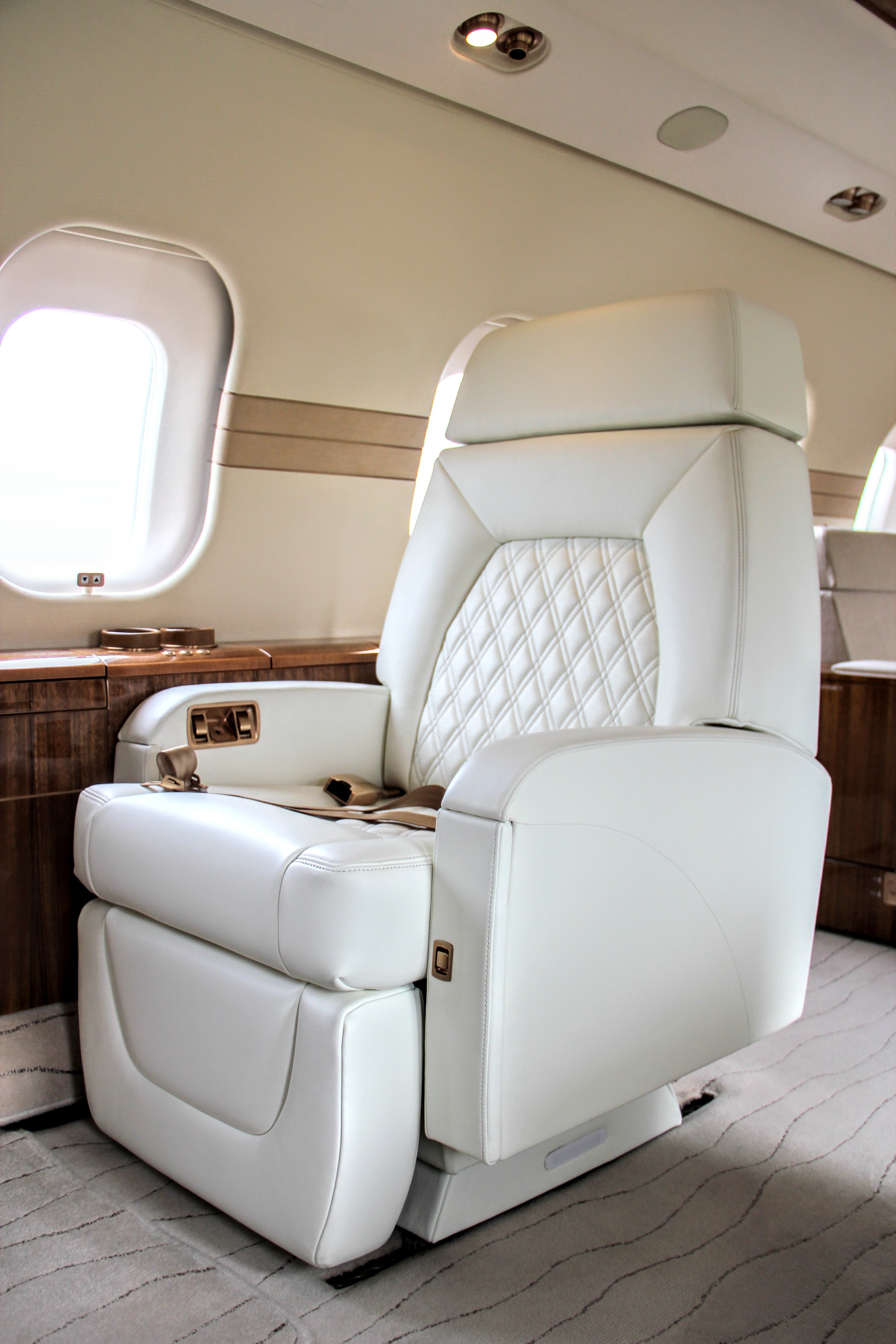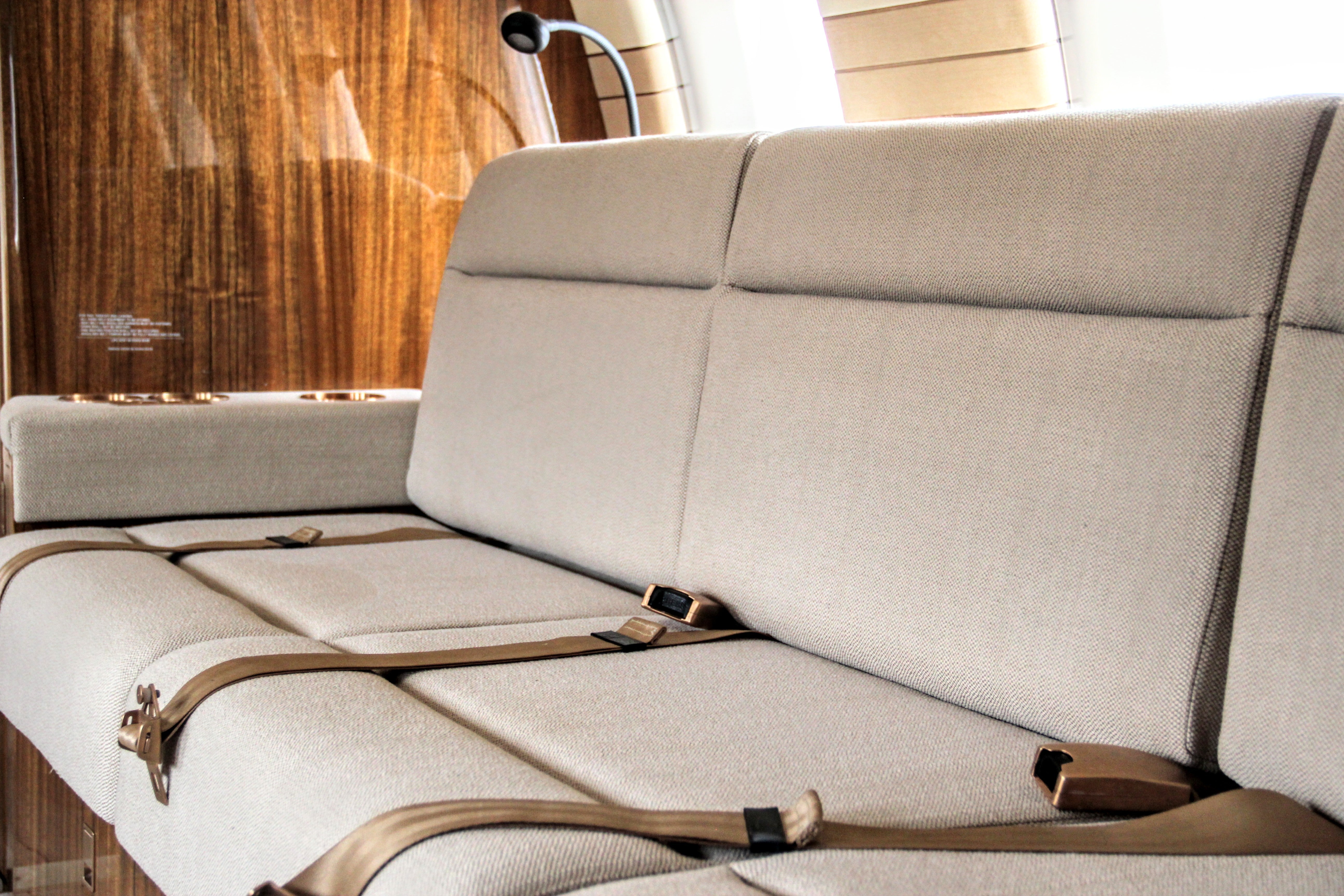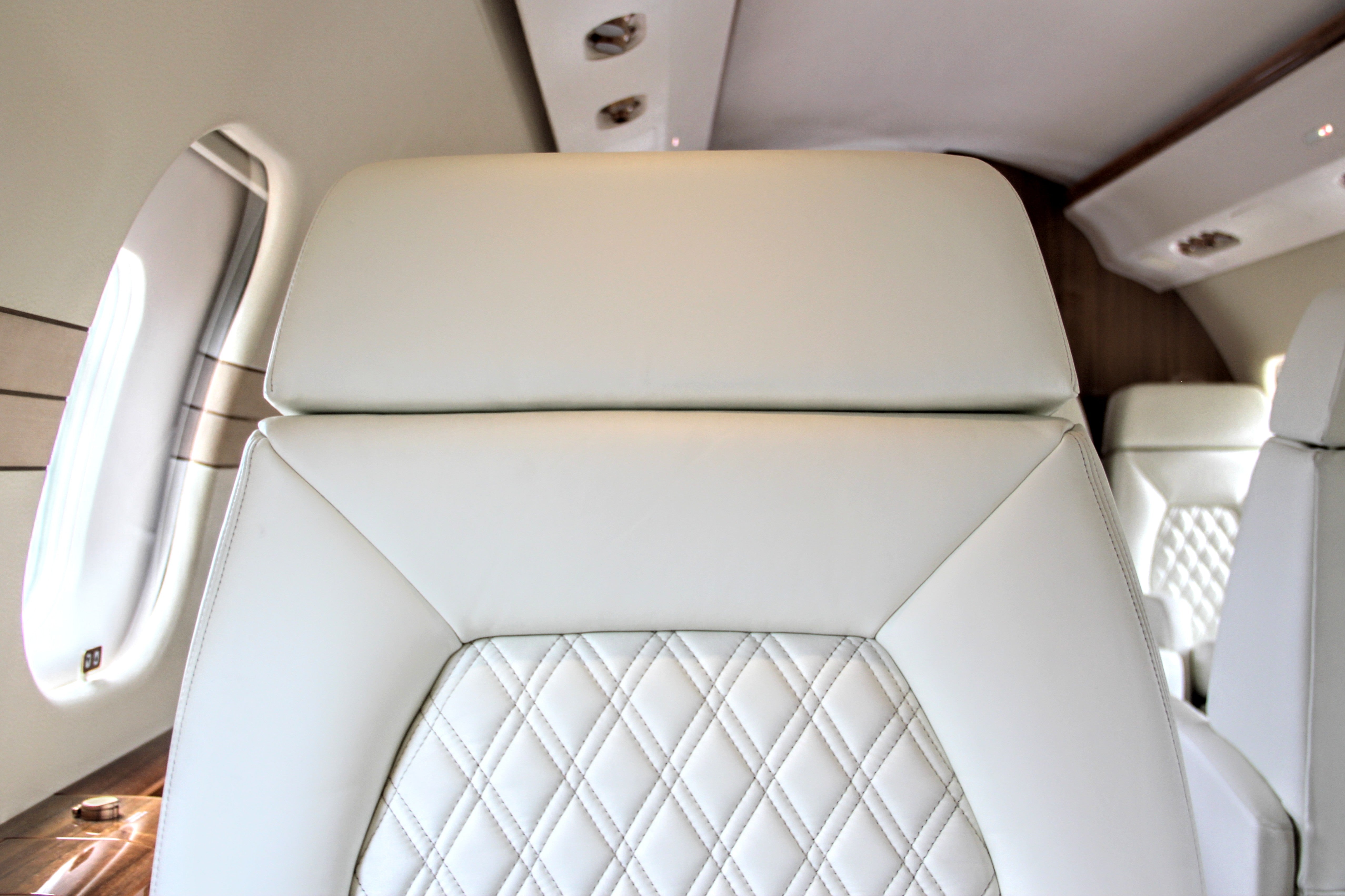 Luxurious, comfortable and beautiful are the three words that best describe this interior. With the VIP seating and toilet seats recovered in cream leather, and the VIP seating with double diamond quilted inserts and matching stitching the whole interior looks classy and beautiful. The divans were covered in a sand colored fabric which works so well with the cream leather. The overall color scheme of this new interior compliments the sleek design of the Global 600 XRS and made it feel like new.