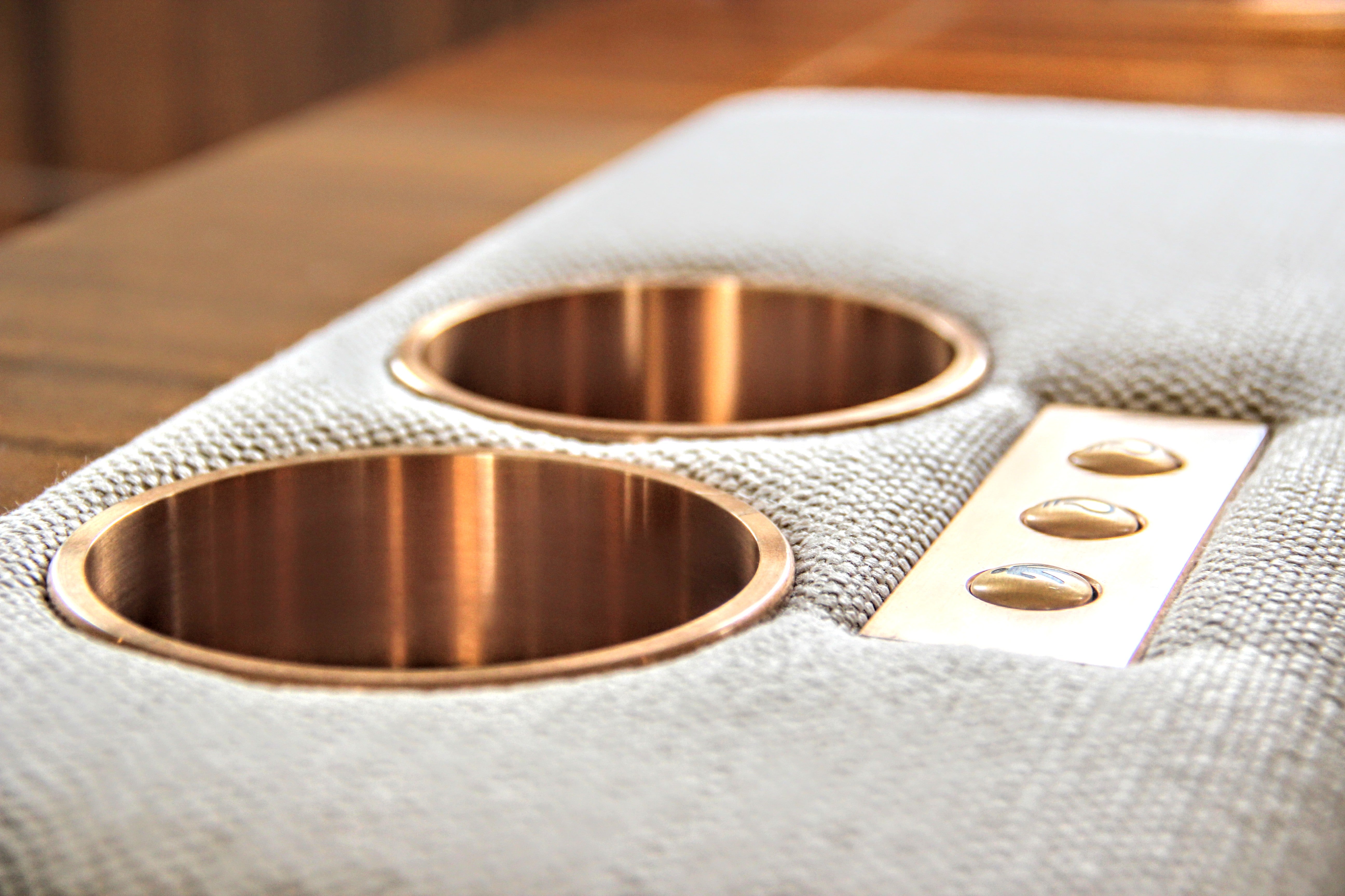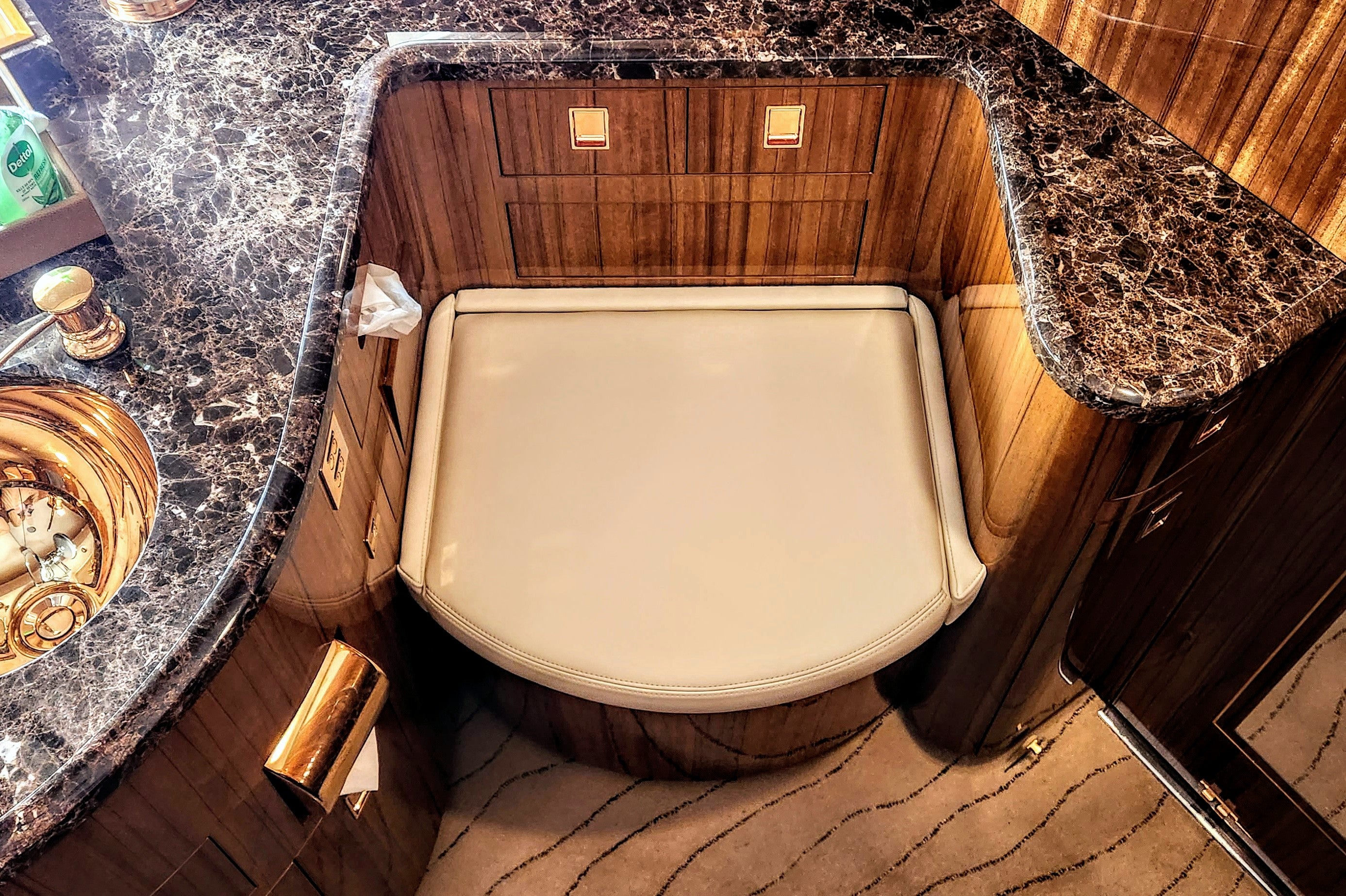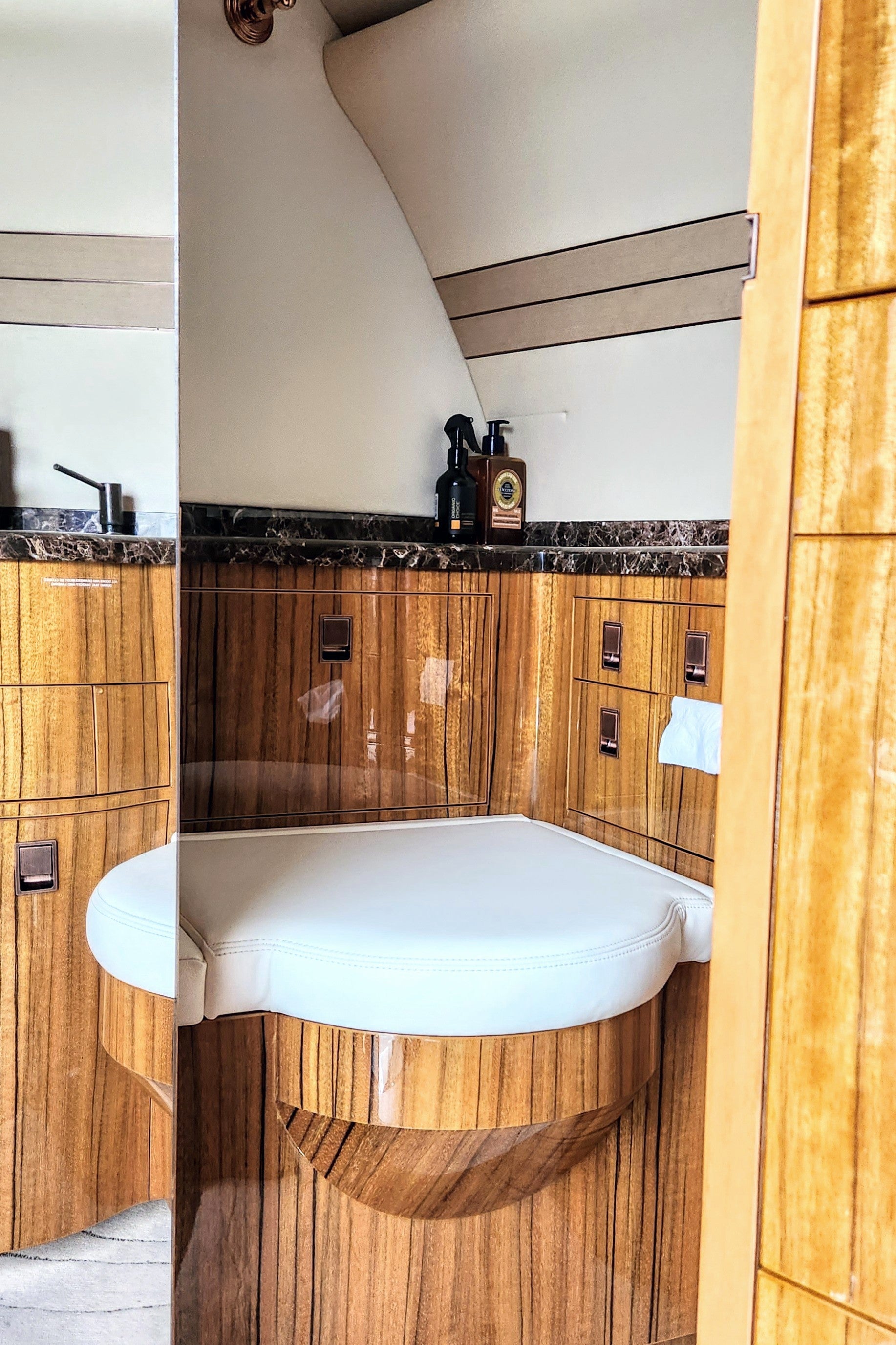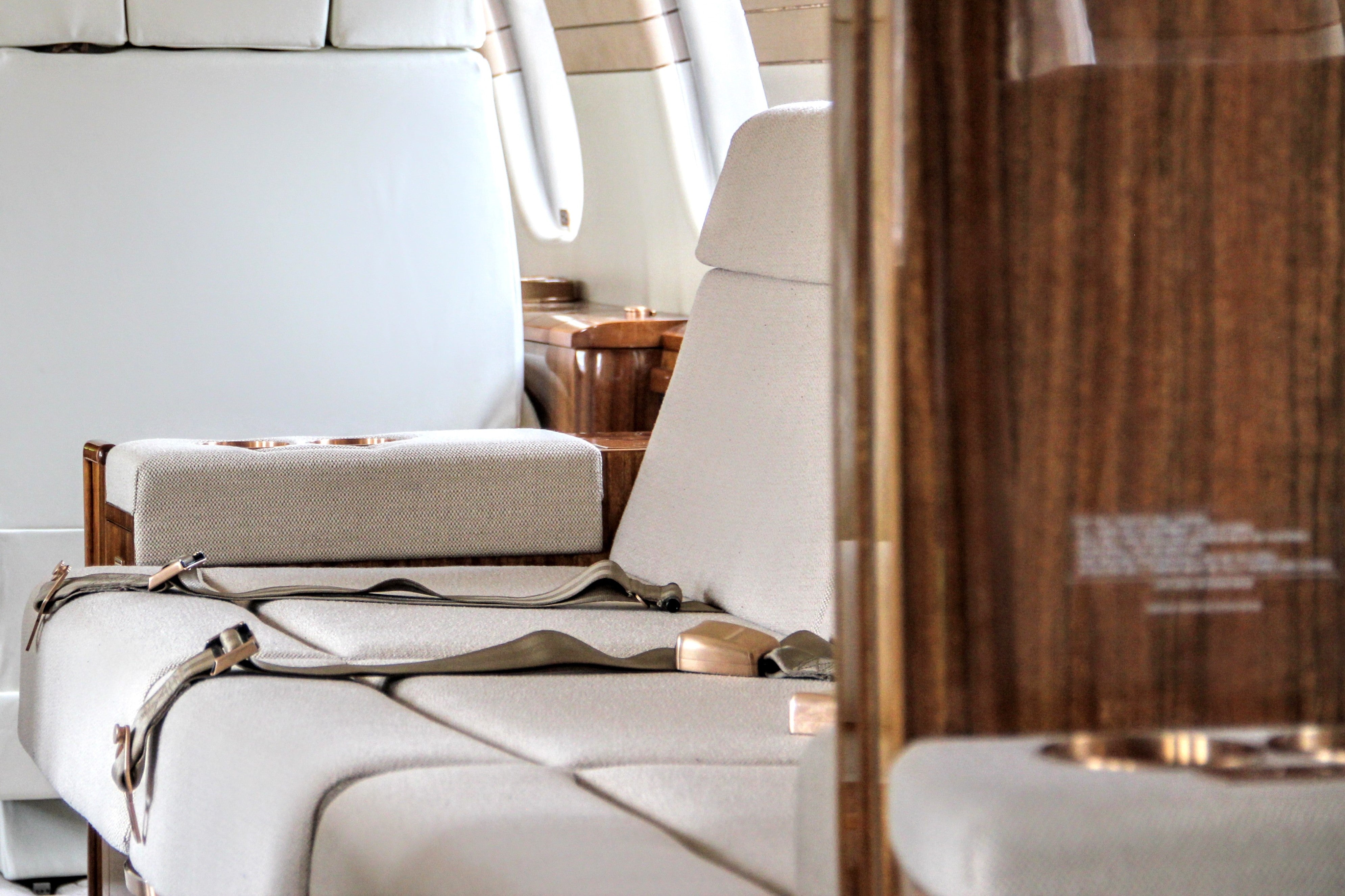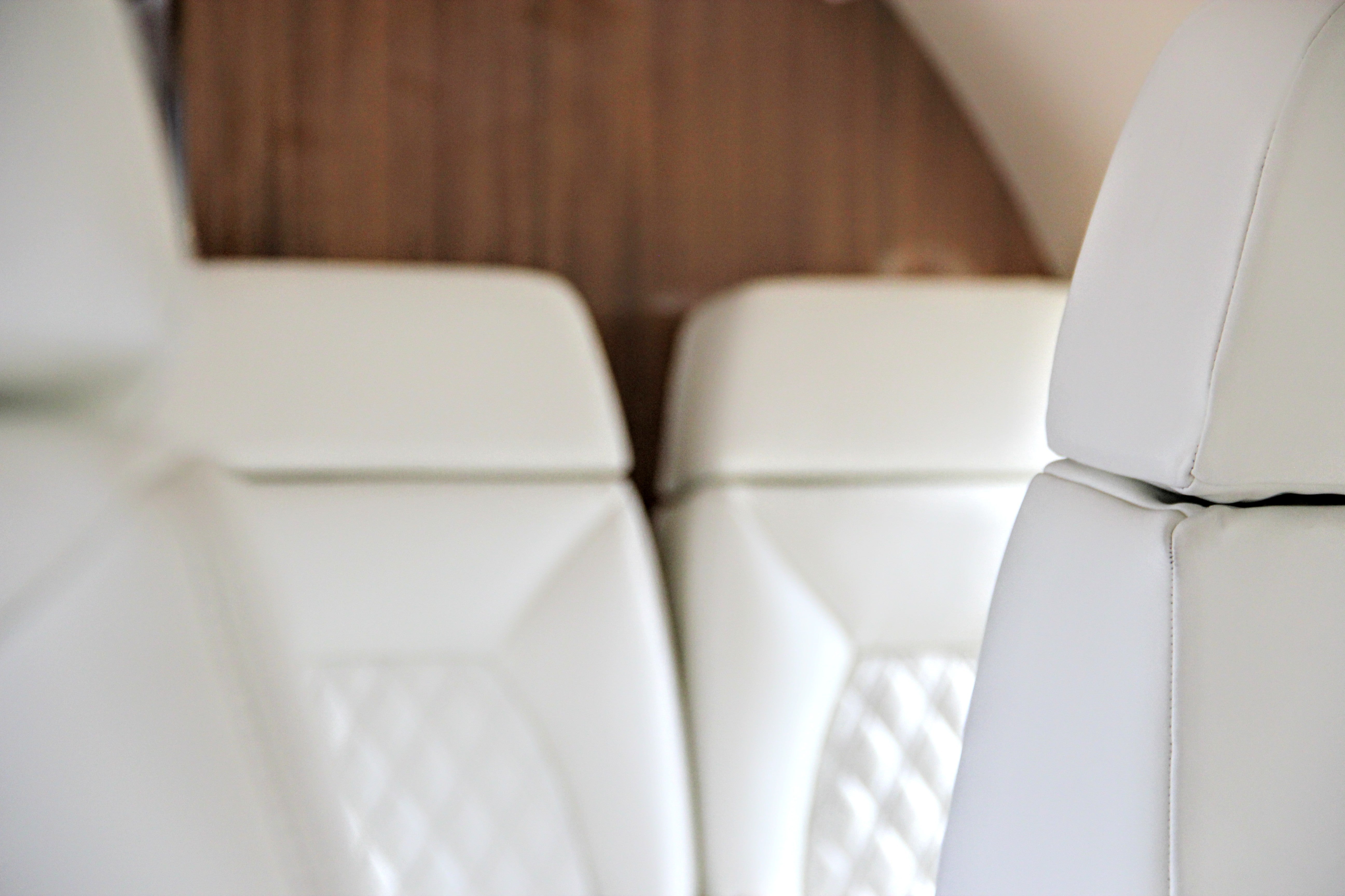 Luxurious, comfortable and beautiful are the three words that best describe this interior. With the VIP seating and toilet seats recovered in cream leather, and the VIP seating with double diamond quilted inserts and matching stitching the whole interior looks classy and beautiful. The divans were covered in a sand colored fabric which works so well with the cream leather. The overall color scheme of this new interior compliments the sleek design of the Global 600 XRS and made it feel like new.