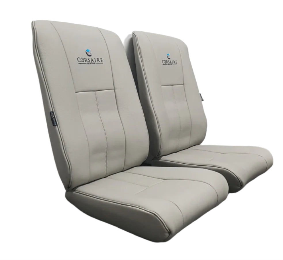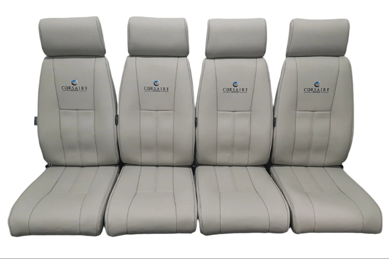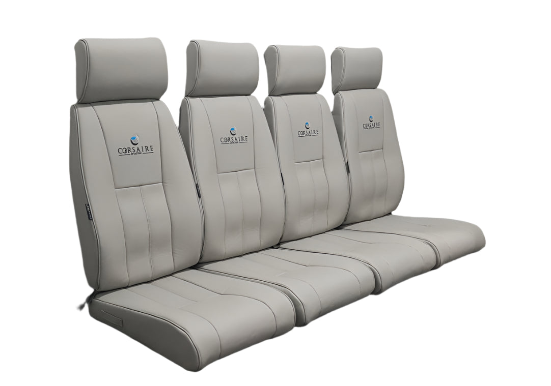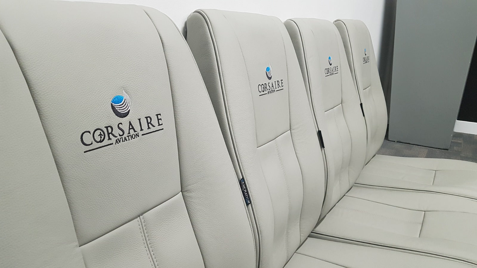 For this AS350 seating upgrade, we used titanium grey leather to provide a sleek, professional finish that complements the helicopter's interior. The outer seams were accentuated with Portland Grey piping, adding a refined outline to each seat. The centre seat inserts were designed with a simple vertical seam, which, paired with matching thread lines, allowed the seats' design to stay understated while focusing attention on the custom branding.